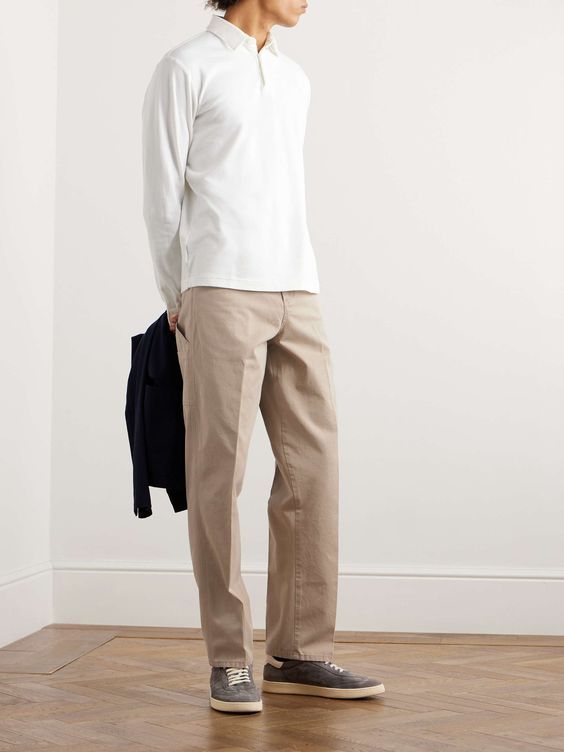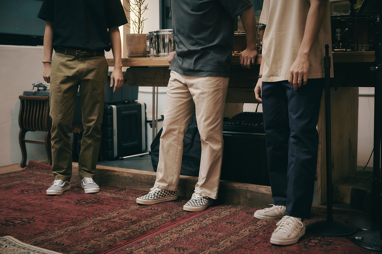 여유로운 치노 팬츠라는 단어는 2가지 의미가 있습니다. 핏이 살짝 여유로울 것, 그리고 소재가 부드러워 편하게 착용하기 좋을 것. 이 2가지 기준은 치노 팬츠를 고를 때 가장 정답에 가까운 요소입니다. 요즘 트렌드가 어떤 것이 있고, 스타일은 어떤 걸 해야 하는지에 전혀 구애받지 않을 베이식이거든요. 지금 같은 날씨에는 그런 트렌드에는 신경 쓰지 않고 이렇게 툭 입고 싶은 게 바로 '여유로운 치노 팬츠'입니다.
