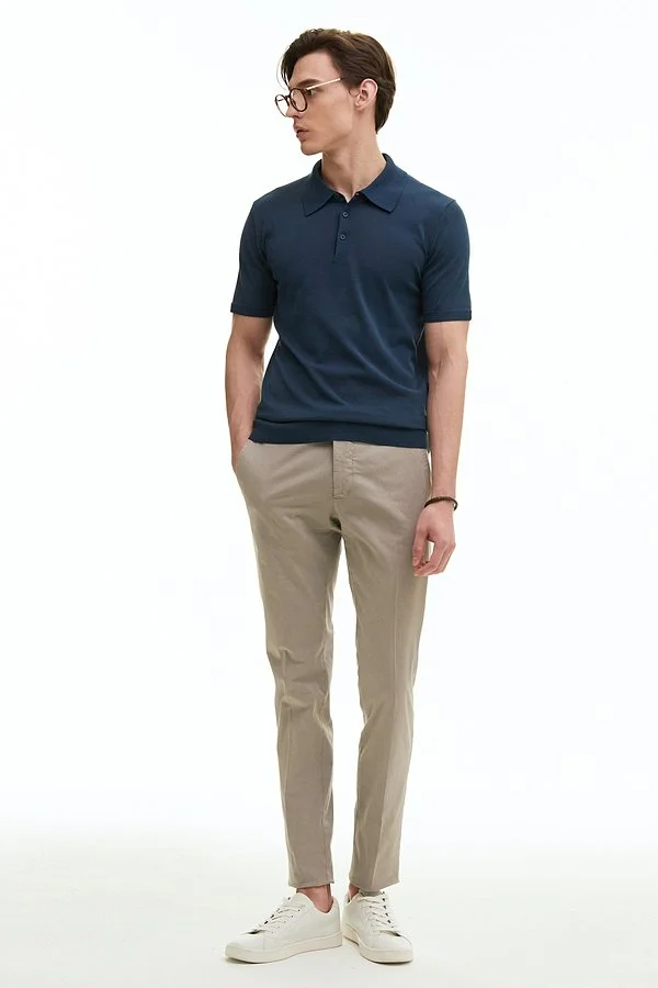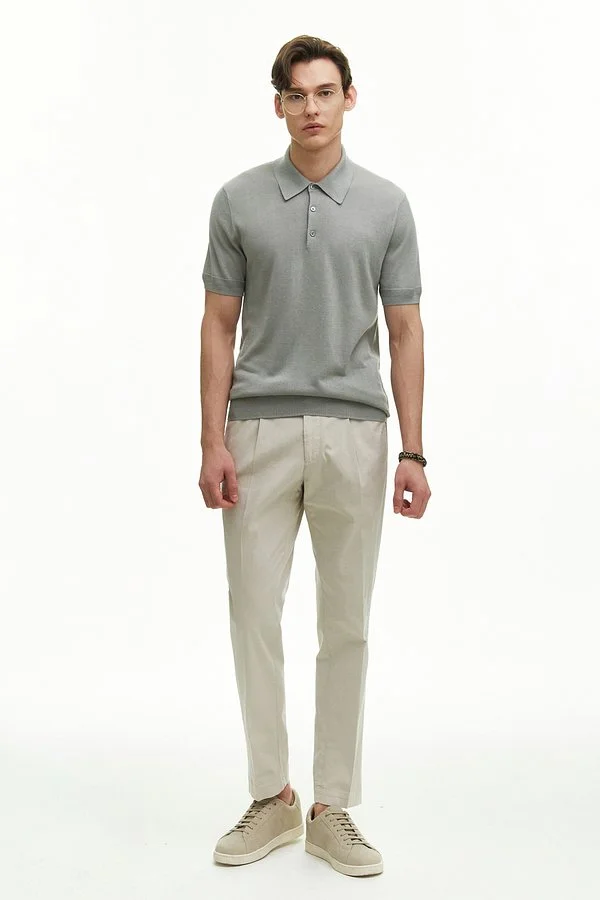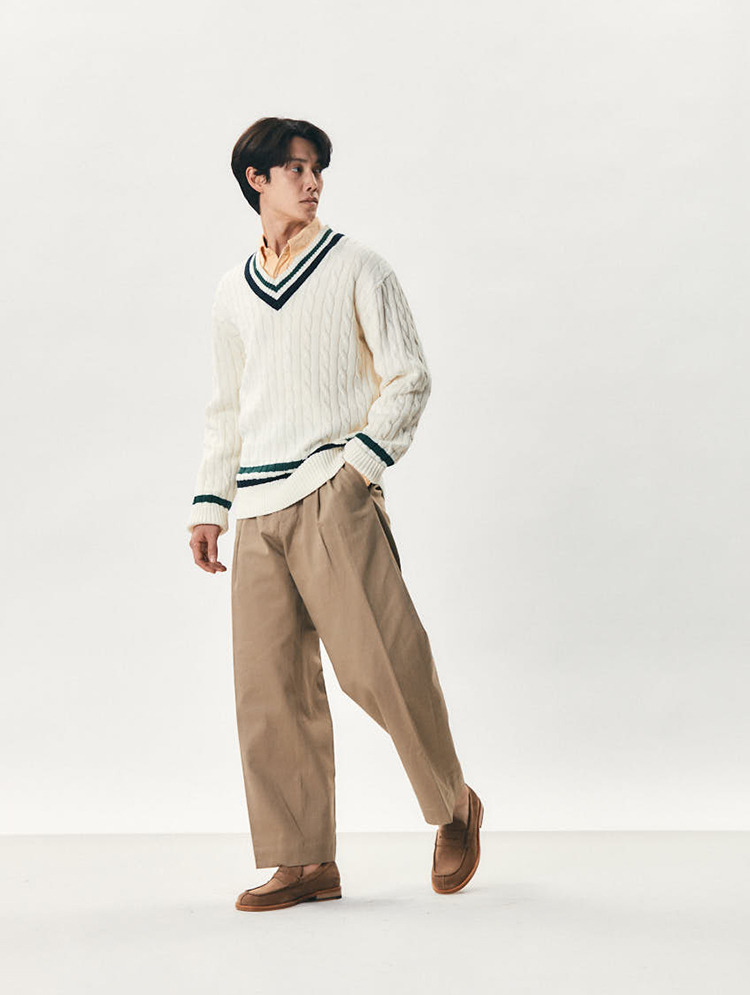 이전 칼럼에서 제안드렸던 치노 팬츠를 연결한다면 좋습니다. 물론 데님팬츠, 울 팬츠와도 조합이 좋습니다만 피케이 니트는 그 부드러움과 여유로움이 치노 팬츠와 상생이 제일 좋습니다.