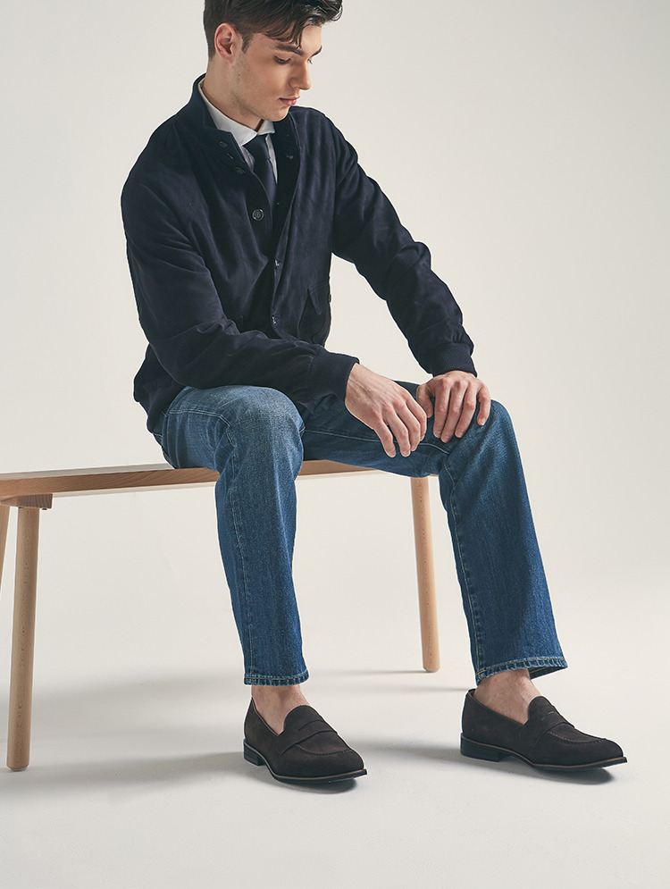 스웨이드 로퍼는 늘 말씀드리는 꼭 필요한 아이템 중 하나입니다. 치노, 데님, 울 등 대부분의 팬츠와 입을 수 있거니와 특히 여름이 가까워질수록 페이크 양말 혹은 맨 발에도 신기 좋은 신발입니다. 무엇보다 피케이 니트와의 조합은 실패할 일이 없습니다.