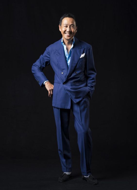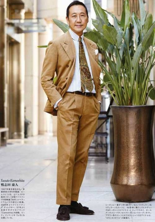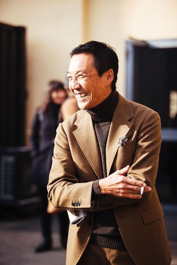 위 사진을 보면 슈트 재킷을 잠근 사진이 살짝 다르게 느껴집니다. 보통 첫 번째 단추를 잠그는 것에 반해 마지막 단추를 잠근 그의 모습을 볼 수 있습니다. 스타일링을 아주 오랫동안 표현하면서 정석을 지키기보다는 룰을 하나씩 깨나 가면서 클래식, 슈트를 다양한 변주로 즐기는 모습입니다. 저를 포함해 우리가 옷을 아직 모를 때는 당연히 기본적인 규칙을 맞추는 것이 당연하지만, 카모시타처럼 50년 넘게 클래식 스타일을 고수해 온 사람에게는 밑에 단추를 잠그는 것이 나름의 엄청난 변주이자 재미입니다. 사진에서 보는 것처럼 이 모습마저도 여유롭게 즐기는 것으로 느껴집니다. 결국 옷을 어떻게 즐기느냐가 얼마나 오랫동안 애정을 유지하는가가 중요한 지를 알게 됩니다.