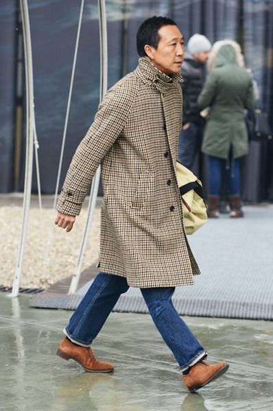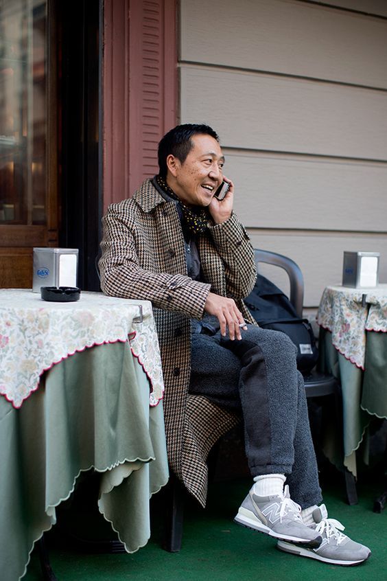 가장 유명한 사진 중 하나인 체크 코트에 데님 그리고 스웨이드 슈즈를 신은 모습은 어떤 시대에 입어도 절대 촌스럽지 않고 오히려 멋진 조합입니다. 이런 조합 또한 카모시타가 지향하는 릴랙스 하면서 적당히 차려입은 멋짐을 표현합니다. 무엇보다 코트의 카라를 바짝 올려 보여주는 스타일링은 무심한 척 계산한 단단한 스타일링의 모습입니다.