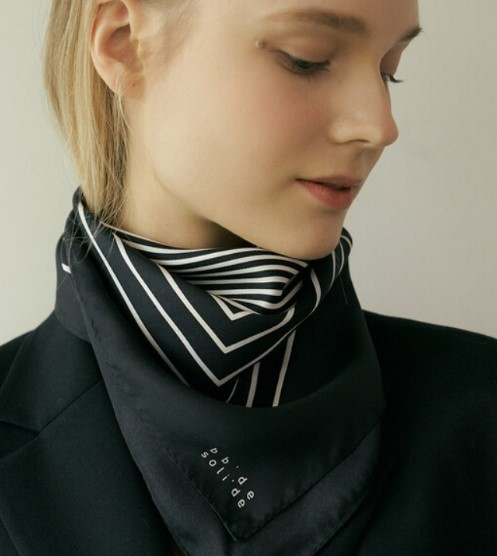 스카프를 선택할 때 아무 문양이 없는 솔리드를 선택하거나 컬러 조합이 2개 이상이 들어가지 않는 것을 선택하면 모던한 무드를 만들 수 있습니다. 패턴 스카프는 화려하면서 포인트적인 요소가 강해 스타일링을 마무리하는데 도움이 되지만 반대로 과한 느낌을 가질 수도 있습니다. 솔리드 쁘띠 스카프의 매력은 셔츠, 니트, 티셔츠에 해도 잘 어울리며 재킷과의 연결성도 좋다는 점에서 솔리드 스카프를 추천드립니다.