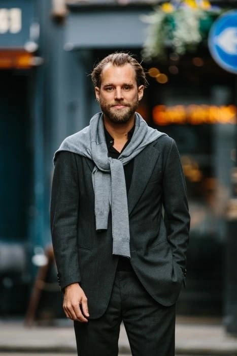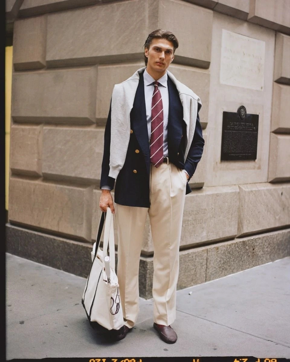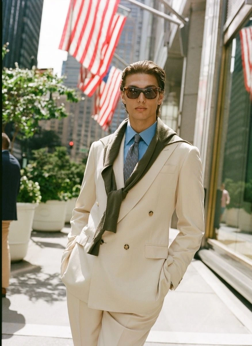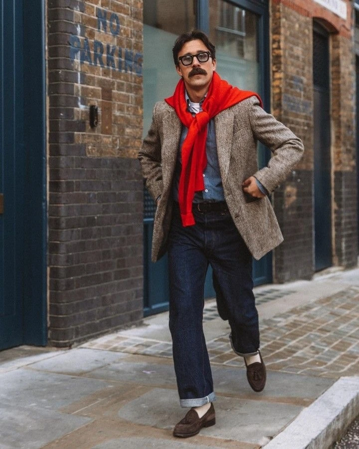 재킷을 어깨에 걸치고 다니는 것만큼 스웨터를 걸치고 다니는 건 사람들에게 유별하게 멋 부렸다는 인상을 줍니다. 들고 다니면 될 것을, 위에 입으면 될 것을 굳이 저렇게까지 어깨에 걸쳐야 하나?라는 사람들의 아니꼬운 시선을 몇 년간은 받았었습니다. 패션을 업으로 삼는 저이지만 이 시선에 늘 당당하긴 어려웠습니다. 특히 슈트 혹은 재킷 위에 스웨터를 걸치는 건 더 눈에 띄는 스타일링이었기 때문입니다. 말끔하게 완성되는 슈트, 재킷 위에 스웨터라니 세상 혼자 멋은 다 부린 느낌이죠.