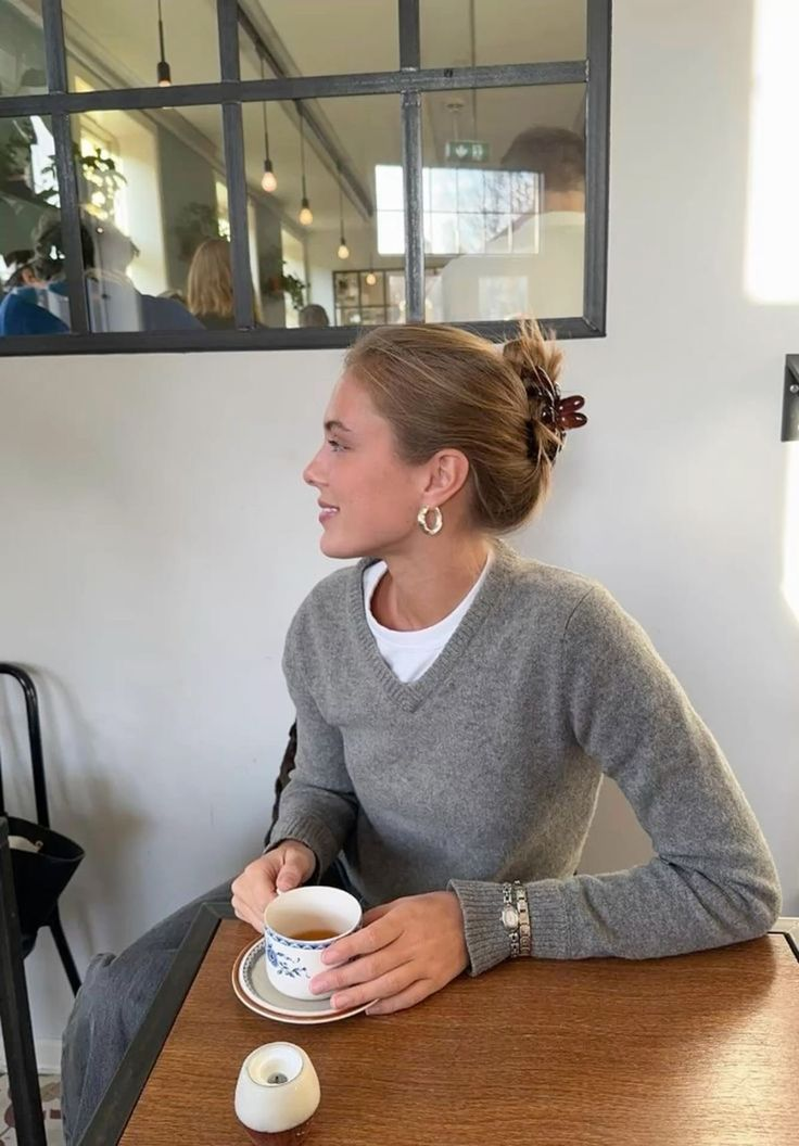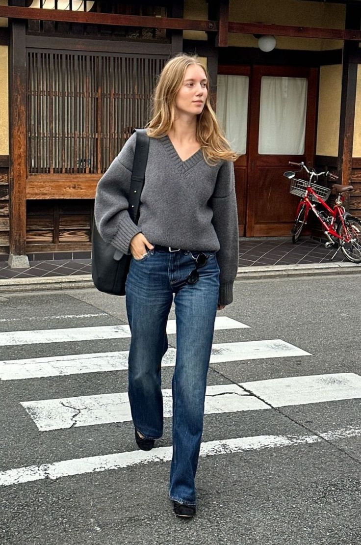 미니멀 연출. 때로는 이너웨어 없이 니트 하나만 단독으로 입어보시길 권합니다. 브이넥 특유의 V라인이 주는 개방감은 목선을 길어 보이게 하며, 답답함을 걷어낸 여유로운 우아함을 채워 넣습니다. 피부에 직접 닿는 울의 감촉은 입는 이에게 특별한 해방감을 선사하며, 자켓을 걸치지 않아도 충분히 완성도 높은 실루엣을 만들어냅니다. 만약 이 느낌이 다소 부족하게 느껴진다면 스카프를 둘러주는 것도 꽤 좋은 스타일링이 됩니다.