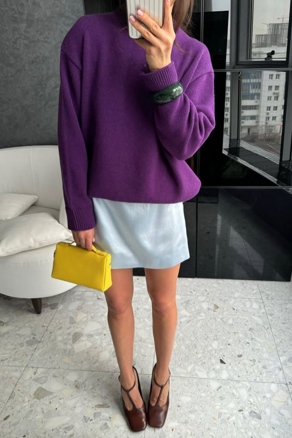 퍼플은 독특한 존재감을 가진 신비로운 컬러입니다. 흔히 소화하기 어렵다고 생각하기 쉽지만, 하이게이지 울 특유의 은은한 광택과 만난 퍼플은 독보적인 매력을 가집니다. 퍼플 니트는 블랙이나 화이트 셔츠와 만났을 때 흔치 않은 독특한 위트를 줍니다. 혹은 스카프(아래 사진)와 함께 했을 때 오묘한 기품을 전달합니다. 남들과는 다른 한 끗 차이의 무드를 원하는 분들에게 퍼플은 가장 영리한 선택지가 될 것입니다.
