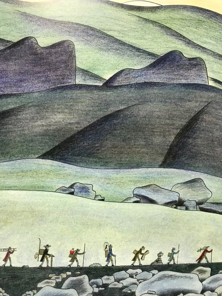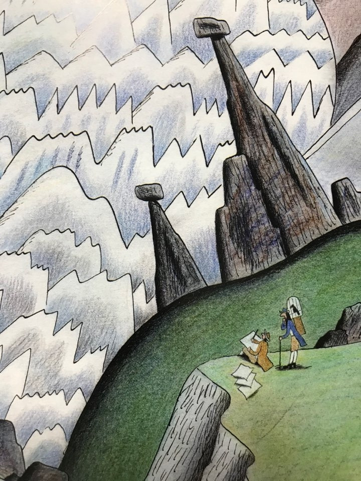 이 그림책에서 살펴본 사람들의 모습은 이렇다. 이들은 줄지어 간다. 경사진 곳을 오르기도 하고 빙하를 앞두고는 크게 쉬어가기도 한다. 어떤 사람은 그림도구로 풍경을 그린다. 18세기 복장이나 헤어스타일을 확인할 수도 있다.