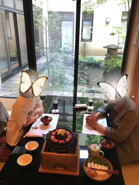 조잘거리는 와중에 아빠는 호텔 앞에 있는 흡연 장소를 찾아냈다. 일본은 야외에도 흡연 장소가 마련이 잘 되어있어 대분의 흡연자들은 지정 구역에서만 흡연을 한다. 아빠의 관찰력에 웃음이 터졌다. 산책 겸 걸어서 조금 늦은 점심으로 아빠에게 꼭 소개해주고 싶었던 식당에 갔다. 1868년에 개업한 유서 깊은(?) 식당으로 기모노를 입은 종업원이 다다미방으로 안내를 해주고 중정이 보이는, 한마디로 요정 같은 분위기의 식당이다. 꽤 금액대가 있고 예약 없이는 갈 수 없는 곳이라 미리 한국에서 예약까지 해두었다. 종업원은 여행객임을 알아보고 먼저 사진을 찍어주겠다고 했고 이 사진이 일본에서 타인이 찍어준 유일한 사진으로 남아있다.