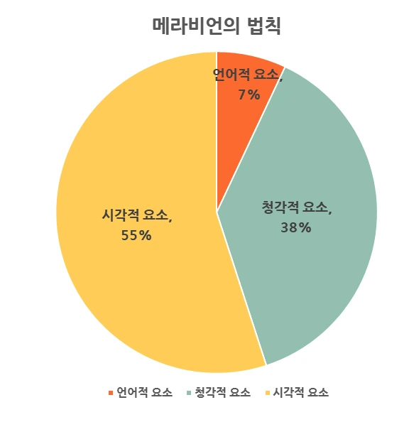 첫인상을 논할 때면 항상 거론되는 법칙이 하나 있다. 심리학자 메라비언이 제시한 '메라비언의 법칙'. 말하기/소통을 주제로 하는 콘텐츠에서는 항상 빠지지 않고 등장하는 법칙으로, 사람 간 의사소통하는 과정에서 상대방의 호감도를 결정짓는 요소의 비율이 언어적 요소 7%, 청각적 요소 38%, 표정과 태도 등의 시각적 요소가 55%를 차지하고 있음을 제시한다.