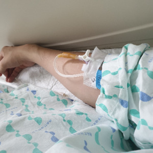 오른쪽 팔 엔 면역 글로불린 주사를, 왼쪽 팔 엔 링거를 꽂고 누워있다.