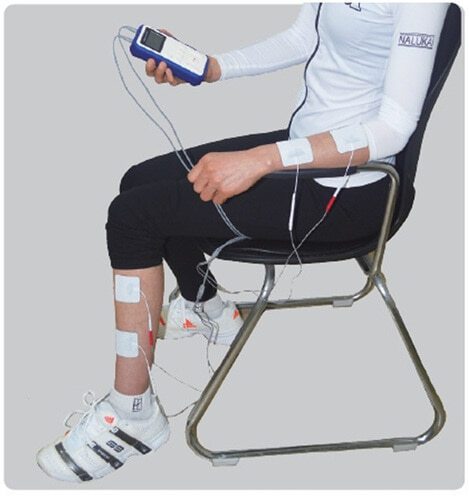 FES 시간엔 패드를 발목, 종아리, 허벅지 등에 붙인 채 전기자극을 준다.