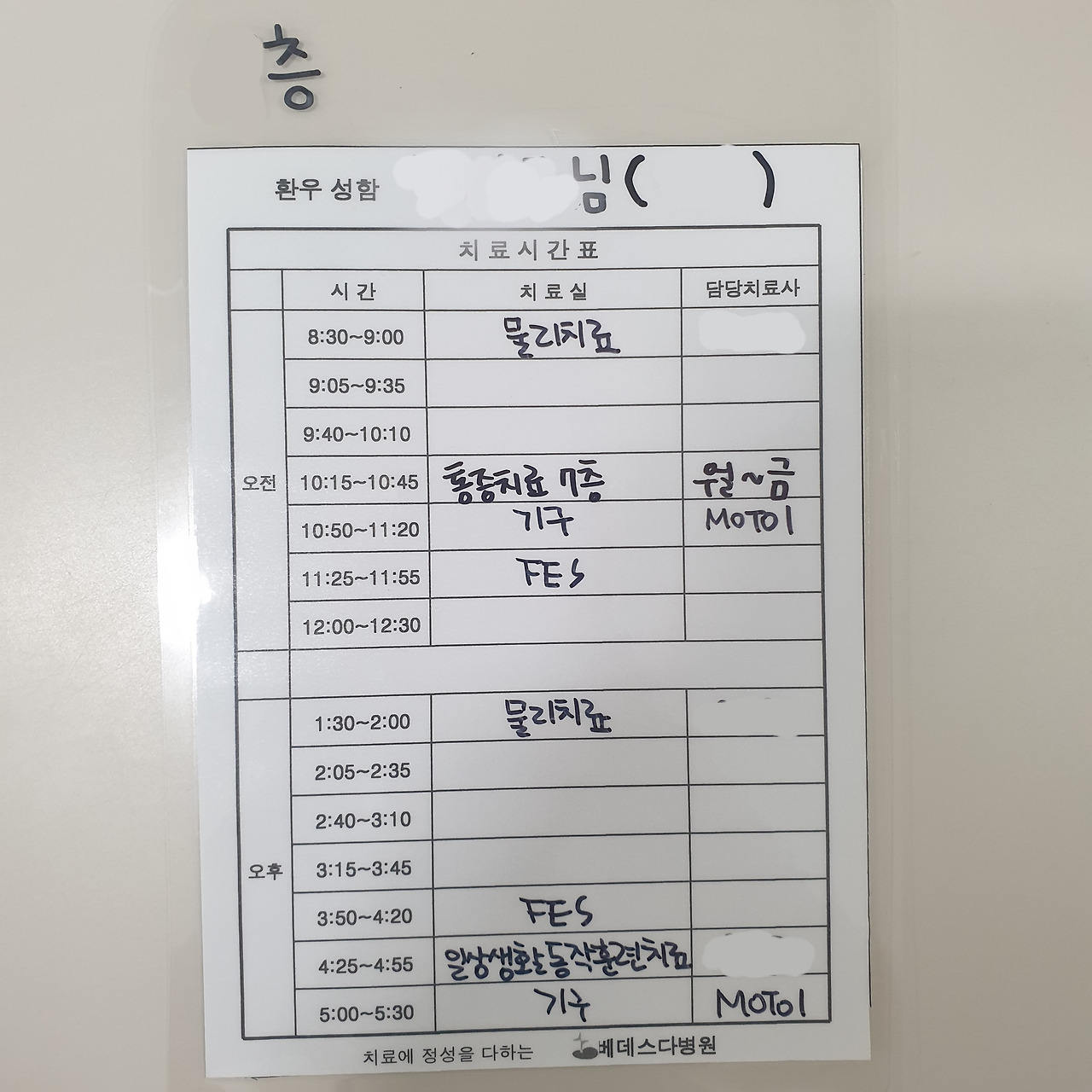 물리치료 두 타임, 작업치료 한 타임, 모토메드 두 타임, FES(기능적 전기자극치료) 두 타임, 통증치료 한 타임.
