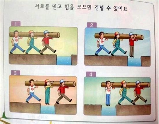 한 때 인터넷에서 관심을 받았던 통나무 들고 다리를 건너는 문제이다. 해당 사진은 도덕 교과서에 실려있는데, 세 사람이 힘을 합하면 다리를 건널 수 있다는 내용이었다. 한번 상상해 보자. 세 사람의 키와 힘, 체격 등은 모두 동일한 조건을 가지고 있고, 통나무의 밀도는 동일하다고 가정해 보자. 이 세 사람은 사진처럼 통나무를 무사히 건널 수 있을까? 결론부터 말하면 못 건넌다.