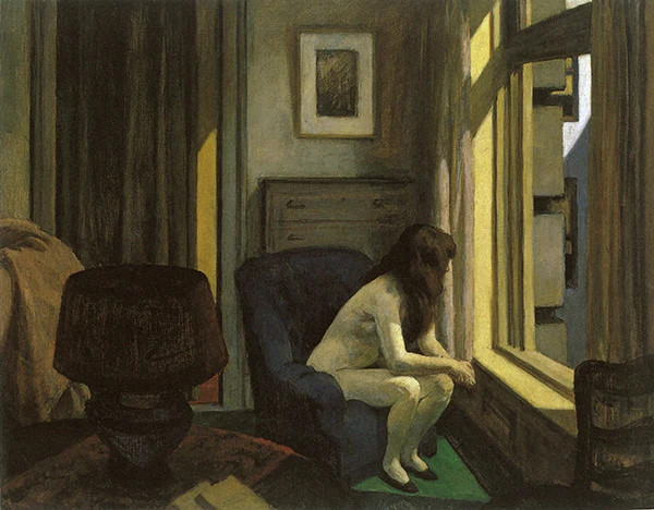 에드워드 호퍼의 작품 <오전 11시>는 한 여자가 나체로 커다란 창문 앞에 몸을 구부리고 앉아있다. 얼굴은 보이지 않으니 표정은 알 수가 없고 머리카락으로 가려진 얼굴이 즐겁지는 않다는 것을 분위기로 알 수 있다. 이 그림을 보고 내가 처음 느낀 단어는 "고립"이었다. 자기만의 세상에 갇혀서 누구의 말도 듣지 않고 사는 모습, 그리고 "상처" 혹은 트라우마라는 말로 대체가 가능할법한 단어다. 필히 누군가에게 상처를 받아 그것을 감내하기 위한 수단, 아니면 슬픔을 이겨내지 못한 감정을 어쩌지 못해 와인을 마시고 나체의 몸으로 덩그러니 조각상처럼 굳어버린 것인지도.