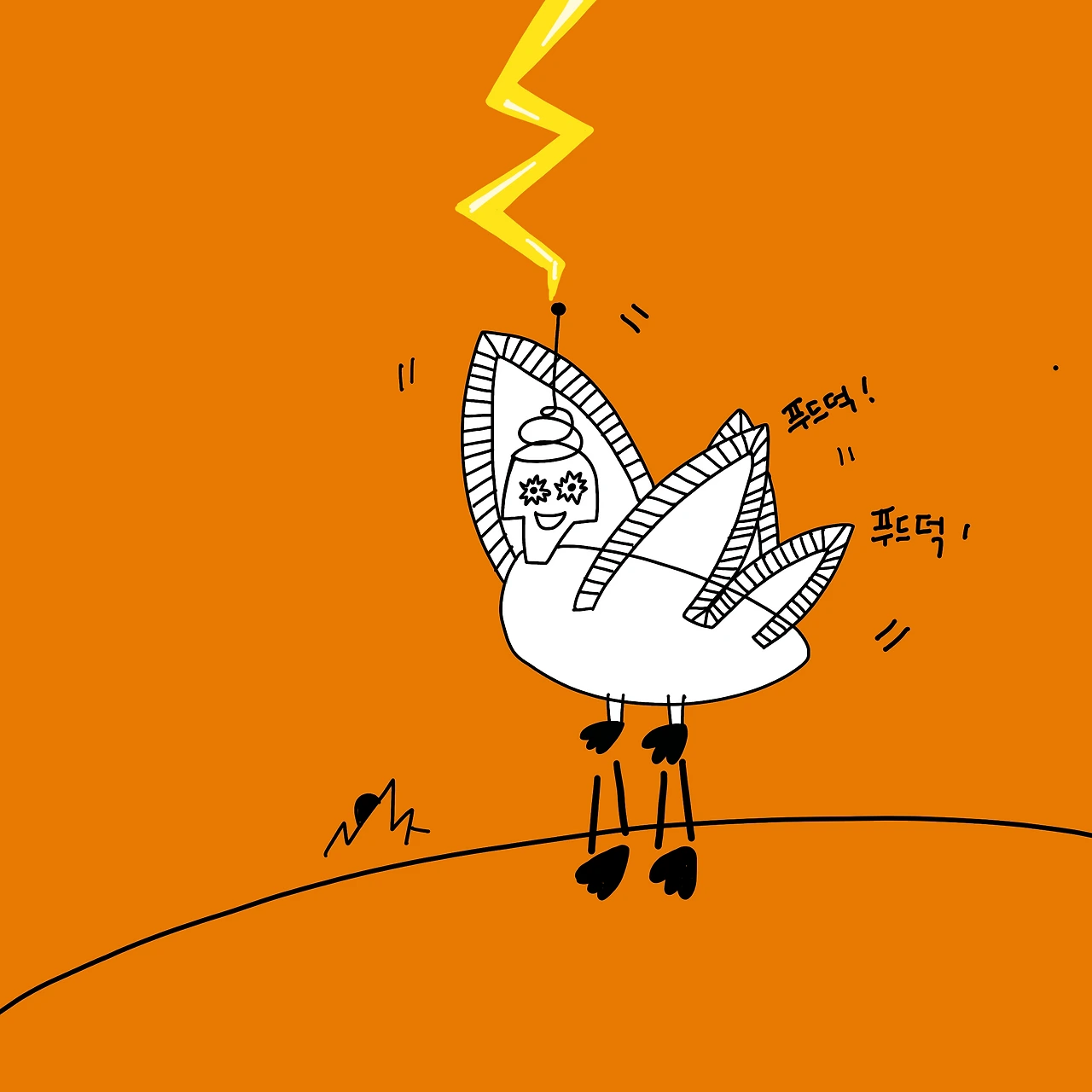 알에서 태어난 로봇새는 땅에서 발을 힘차게 떼어 본다. 왜냐하면, 나에게 어떠한 잠재 능력이 있는지 나도 알지 못하니 발을 떼어 보는 수밖에. 날갯짓을 하며 날아가는 새가 되어 준다면 더 먼 자유까지 누릴 수 있는 존재가 되어줄 테니. 자유를 맛보기로 했다면 점프해! 너는 날 수 있어!