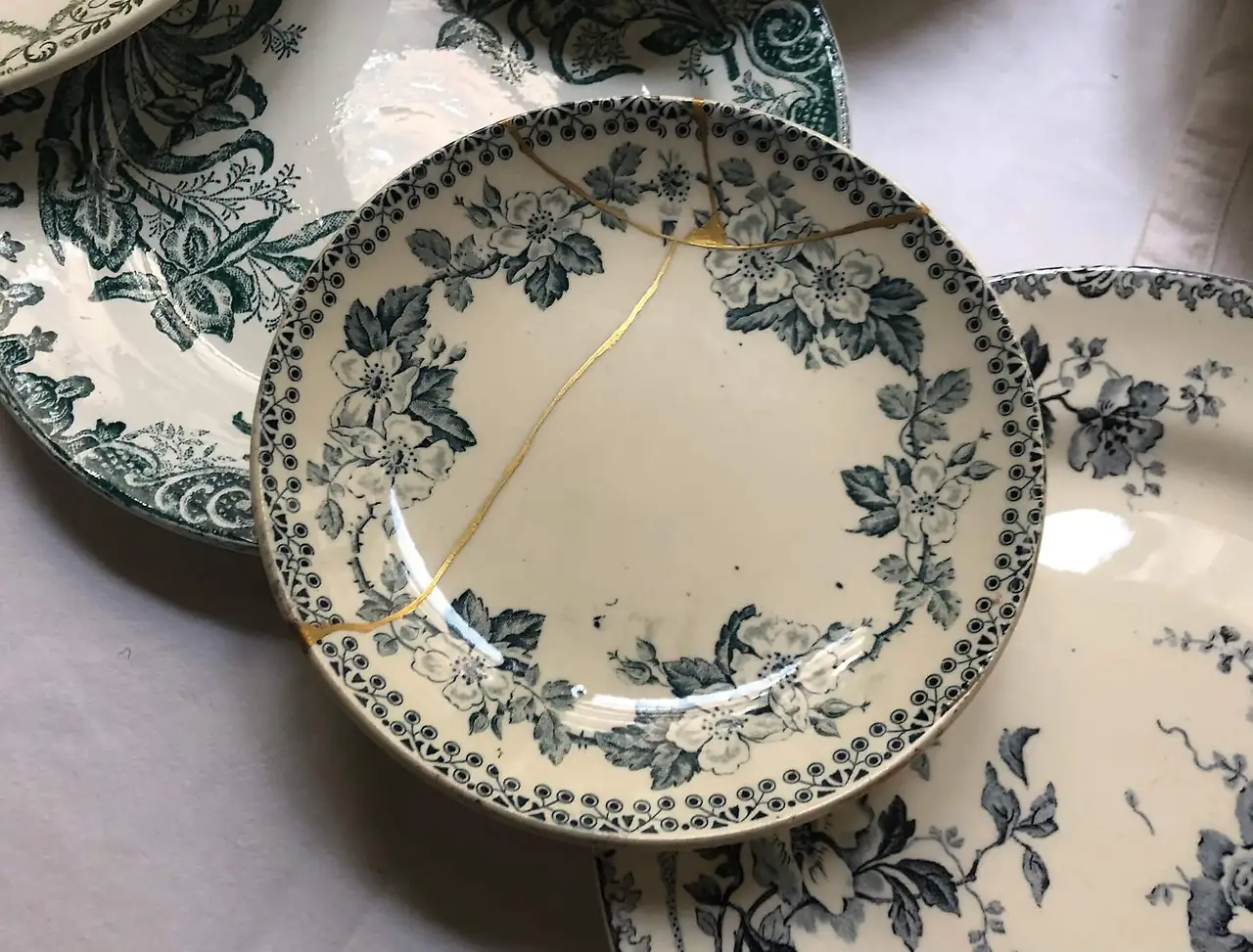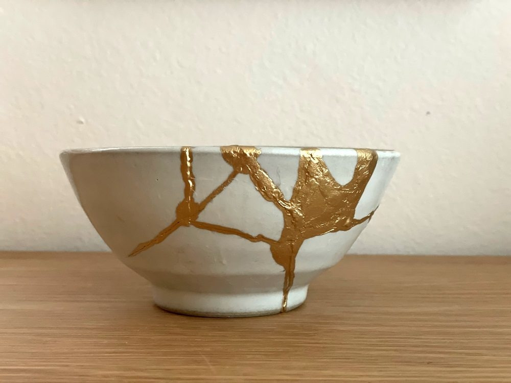 깨진 조각들을 모아 붙인다 해도 조각들의 사이에는 완전히 가루가 나버려 절대로 메울 수 없는 부분이 있다. 그런 부분들을 금을 섞은 접착제로 메우기