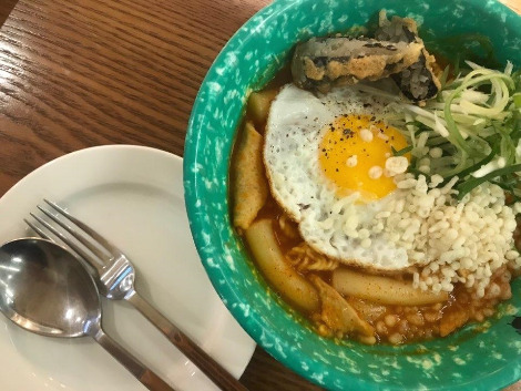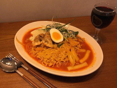 라볶이와 맛은 비슷하지만 국물이 좀 더 많고 떡보다 면이 더 많고 삶은 달걀 대신 반숙이 올라갔다.