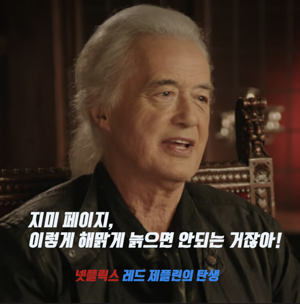 넷플릭스 인터뷰에 답하는 지미 페이지의 얼굴은, 보는 나도 절로 미소 짓게 만들었다. 부드럽게 굽이 치는 눈주름과 투명할 정도로 매끈한 피부, 자연스러운 은발은 또 어떤가? 초점을 잃은 오컬트적 시선에 흑마술사 같던 어둠의 흔적조차 찾아볼 수 없다.