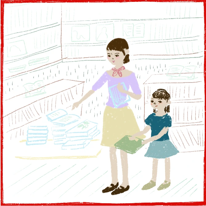 아이가 책을 신중히 고르는 동안 책을 들춘다. 가장 눈에 띄는 낱말은 ‘호기심’-