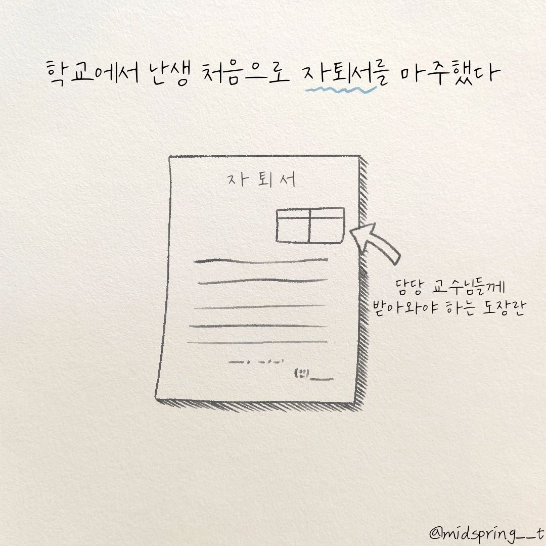 그 뒤로 좀처럼 시간이 맞지 않았다가 처음으로 선후배 사이로 만난 날이었다. 처음이자 마지막이 되어버린 아이러니. 반가운 인사도 잠시, 선배가 카페에서 기다리는 동안 자퇴 서류 처리를 서둘렀다. 난생 처음보는 자퇴서류에는 담당교수님을 포함한 총 두 분의 디자인학부 교수님들의 도장 칸이 뚫려있었다. 담당교수님이라고 해도 안면이 거의 없기에 여간 골치라 생각했다. 서류를 내보이면 자퇴 사유를 물어보실테고 그를 조리있게 설명할 자신은(마음은) 없었기 때문에.
