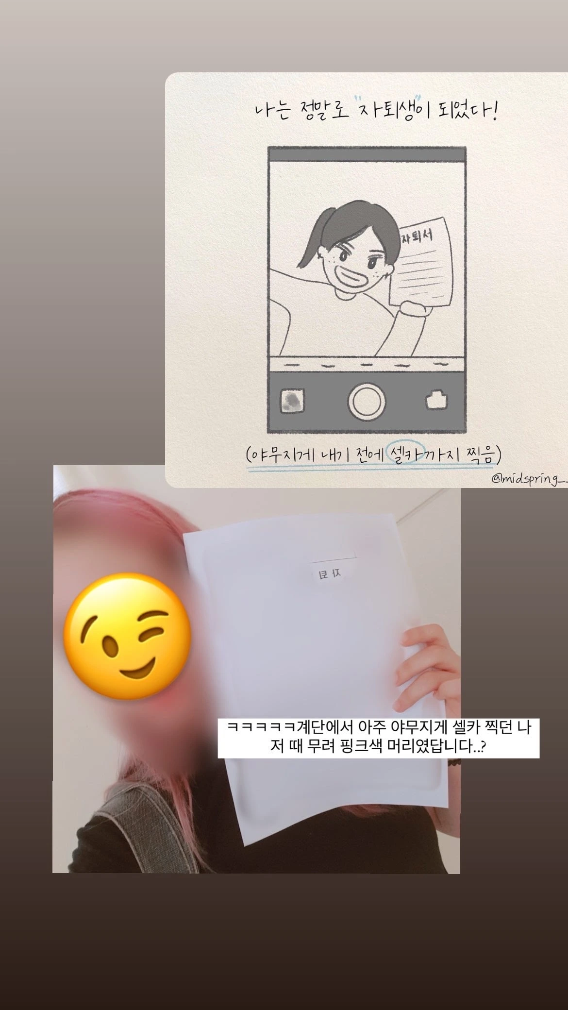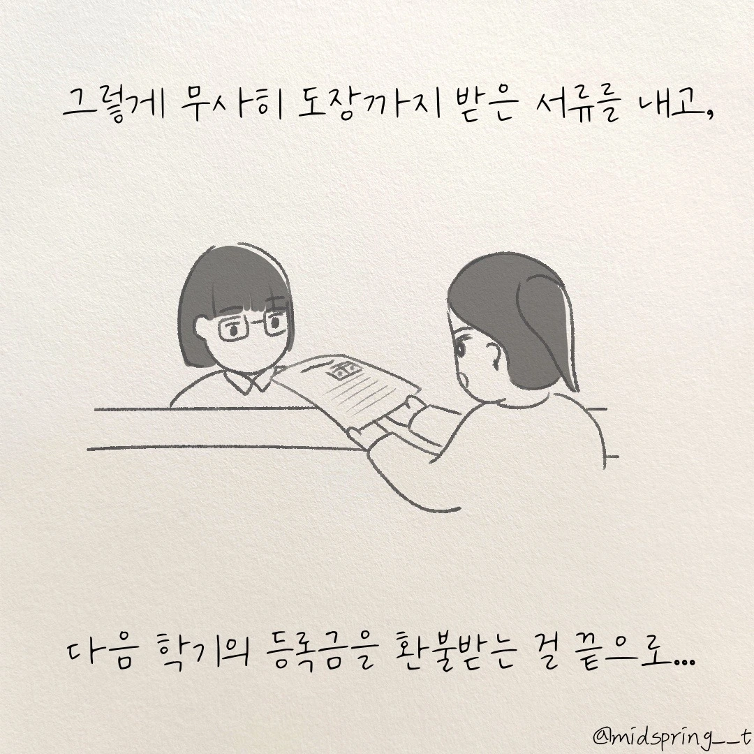 두 칸의 공란이 무사히 메꿔지고 오늘의 날짜를 적고 성명, 사인까지 마쳤다. 미대 건물 계단을 내려오며 잊지 않고 자퇴서와 함께 찍은 셀카는 지금도 잘 보관중이다. 그동안 기다려주던 선배와 함께 서류를 제출하러갔다. 미션 컴플리트를 한 서류를 내는 순간까지 행동의 막힘은 없었다. 직원분이 당시 날짜를 기준으로 환불 받을 수 있는 등록금을 계산해주셨고, 서류 또한 막힘없이 빠르게 처리되었다.