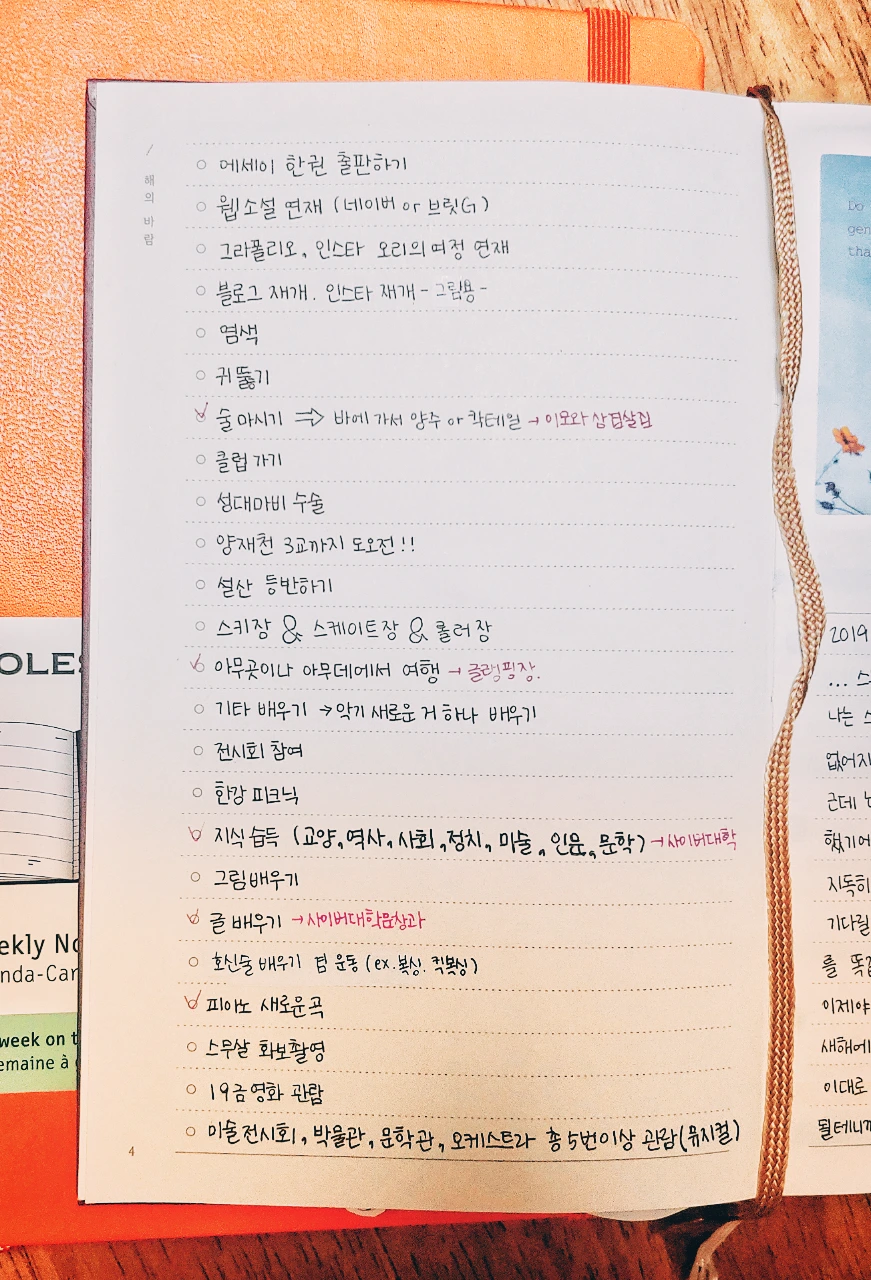 24개의 목록 중 체크 표시해놓은 '7. 술 마시기', '13. 아무 곳이나 여행', '17. 지식 습득', '19. 글 배우기', '21. 피아노 새로운 곡'을 뺀 나머지 열아홉 가지는 코로나로 인한 상황 때문에 올해 안에 마치기가 힘들 것 같다. 대부분이 바깥에서 하는 활동(설산 등반, 한강 피크닉, 19금 영화 관람, 전시회장 가기 등)이기에 나는 할 수 있는 것을 최대한 추려보았다. 그중 '그림 배우기'는 클래스 101 같은 온라인 강의를 신청해서 들으면 될 것 같고, '염색하기'은 셀프 염색으로 대신할 수 있을 것 같다.