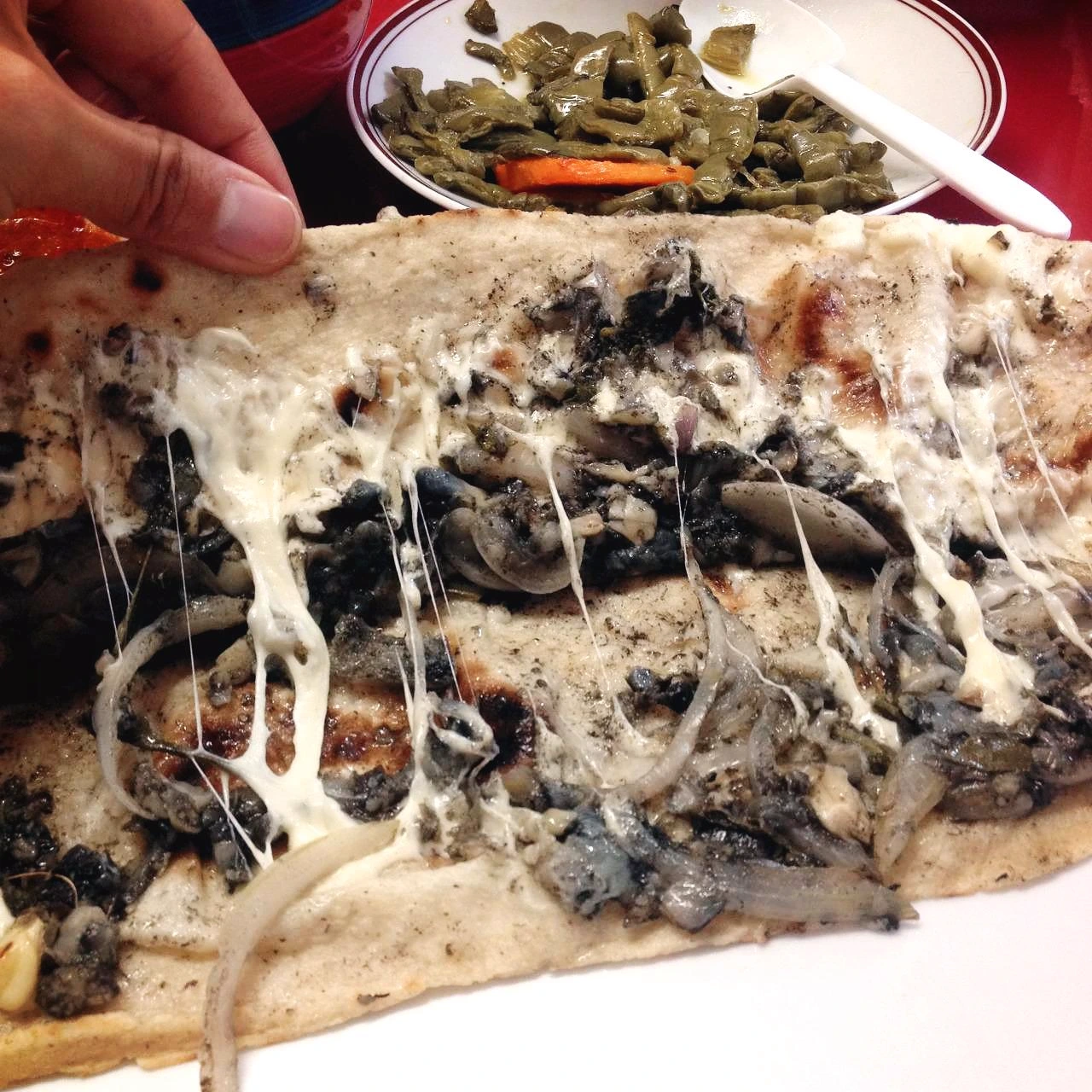 어쩌면 당연하게도 그 어느 것도 화려하거나 섬세한 맛은 아니다. 곤충 튀김은 시큼한 라임 주스나 매콤한 고추 소스를 버무려 부러 곤충의 맛을 가린 느낌이었고, 이름 모를 채소와 함께 푹 고아진 질척이는 개미 알 수프는 국보다는 죽에 더 가까웠다면 너무 야박한 평가일까. 아무래도 모험심 넘치는 시도를 넘어 이 요리들을 진심으로 음미할 수 있게 되려면, 개미 알 수프에 엮인 추억 서너개 즈음이 필요할 것 같다. 다행히 마침 제철을 맞아 집 앞 께사디야 아주머니의 행상에 단골 메뉴로 등장하던 후이틀라꼬체는, 오고 가며 몇 번 먹어보고 나니 그 맛을 '배울 수' 있었다. 깊은 땅의 맛이 우러나오는 이 옥수수 곰팡이는 흡사 흙과 비의 내음을 머금은 버섯과도 같았다. 멕시코 생활을 시작한지 몇주가 흐르자, 나는 비가 온 다음 날이면 후이틀라꼬체가 들어간 께사디야가 생각나기 시작했다.