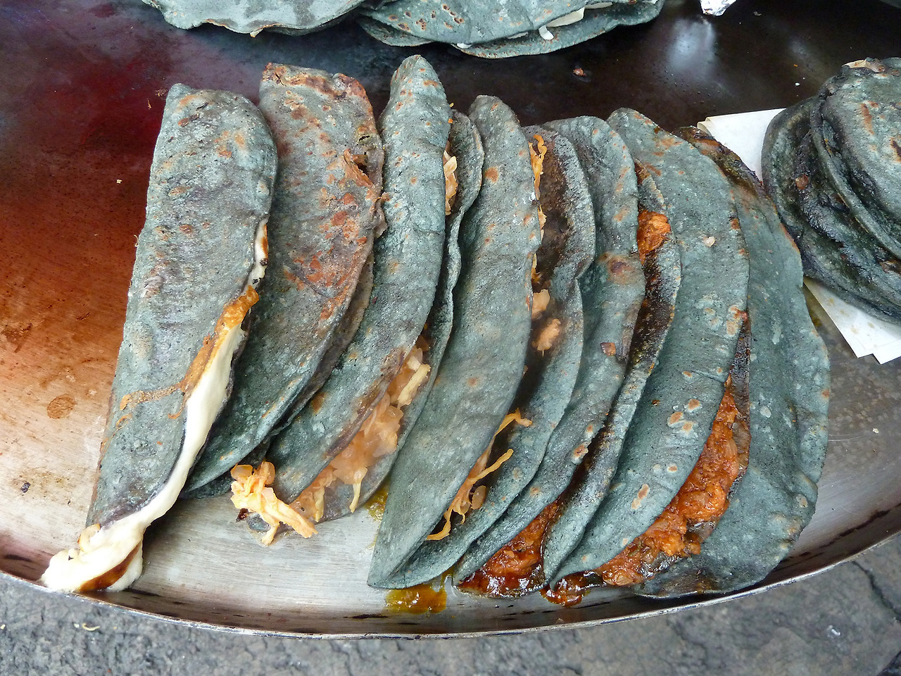 * 왼쪽부터 시계 방향으로 2. 타코(Taco), 3. 블루콘으로 만든 께사디야(Quesadilla), 4. 메메라(Memela), 5. 틸라유다(Tlayuda)