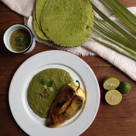 달큼한 뽀블라노 고추(Poblano: 피망과 비슷한 종류로, 피망보다 약간 더 질기고 매콤하다)를 불에 훈제한다. 겉면이 고루 까맣게 될 때까지 훈제한 후, 면포나 비닐봉지에 넣고 10~15분간 덮어 둔다. 일명, 고추 땀 빼기(Sweating) 과정. 그렇게 땀을 한 김 빼고 나면 땀을 흘리고 난 고추의 껍질이 스르르 쉽게 벗겨진다. 그렇게 스모크 향이 근사하게 벤 고추 안에 치즈 또는 볶은 고기를 채운 후 계란을 휘저어 거품 낸 계란물을 입혀 튀겨내면 칠리 레예노가 완성된다.