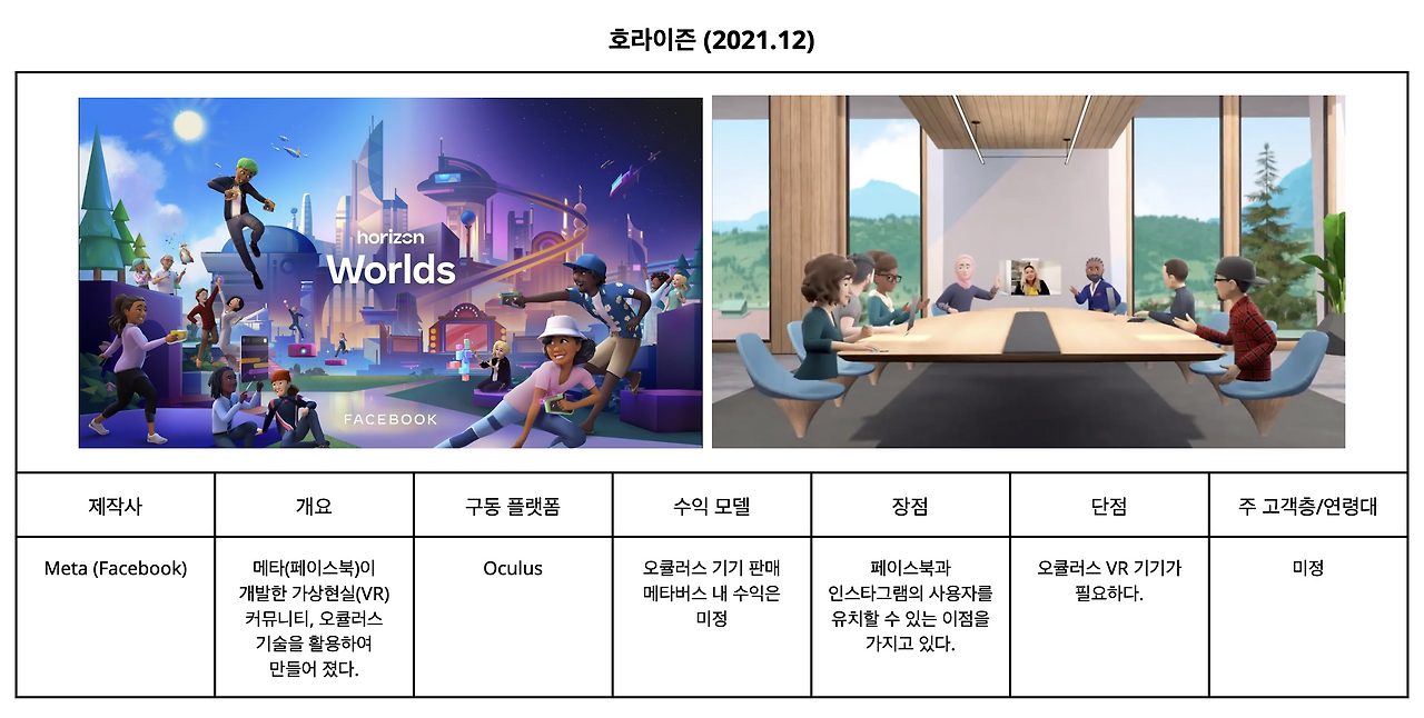 많은 메타버스 플랫폼이 게임이나 엔터테인먼트 요소를 필수적으로 포함하고 있는데, 호라이즌은 실제 회의, 교육과 같은 가상현실에서 사람들을 직접 만나는 것을 중심으로 설계되어 있다. 현재 호라이즌 월드를 서비스하고 있고, 본격적인 업무 서비스인 호라이즌 워크룸의 출시도 앞두고 있다. 일상생활을 그대로 메타버스로 옮기기를 원하는 태도다. 현재 잦은 버그와 오큘러스의 필수적인 사용 이슈로 사용자는 점차 줄어들고 있다. 호라이즌은 뚜렷한 컨셉에 대한 제시가 없어 사용해야 하는 이유와 필요성을 느끼지 못하게 하고 있다.