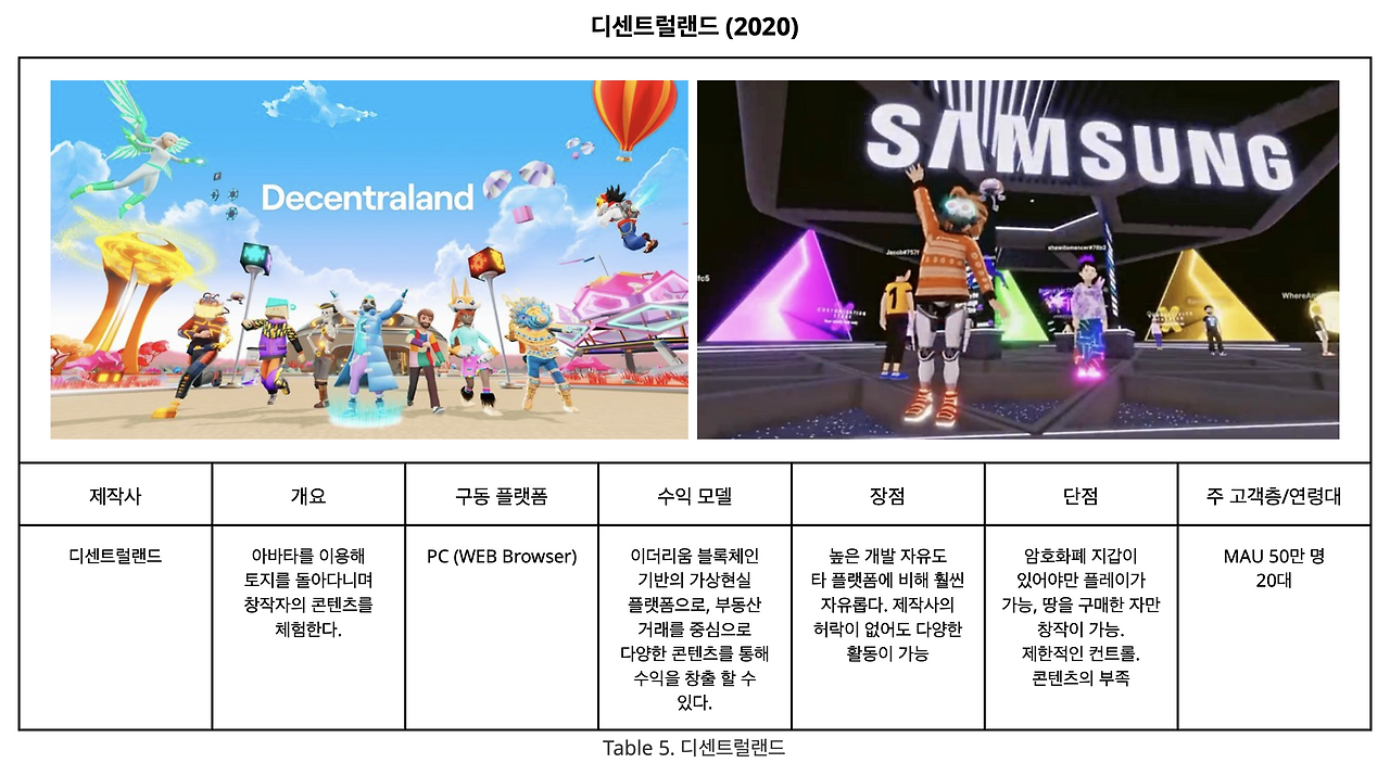 가상현실 내 부동산을 거래하는 메타버스다. 우리가 잘 알고 있는 삼성, UPS, 소더비도 디센트럴랜드에 땅을 사고 고객센터를 지었다. 토지는 대체 불가능한 소유권을 주장할 수 있으며, 양도가 가능하다. MANA(마나)라고 하는 ERC20 토큰을 사용하여 다양한 거래를 할 수 있다. 디센트럴랜드는 암호화폐의 글로벌하고 즉각적이며 저비용의 지불방법을 지원하기 위해 탄생했다. 제작자와 사용자 간에 암호화폐를 통해 저비용으로 직접 지불하는 방식을 통해 인터넷 상거래를 근본적으로 변화시키는 것을 목표로 한다. MAU는 타 메타버스 플랫폼에 비해 적지만 암호화폐 시가총액은 약 6 조가량으로 메타버스 관련 코인 중 1위다. 암호화폐의 활용의 기회가 더 열린다면 디센트럴랜드는 타 플랫폼에 비해 유리한 환경에 금세 위치할 수 있을 것이다.