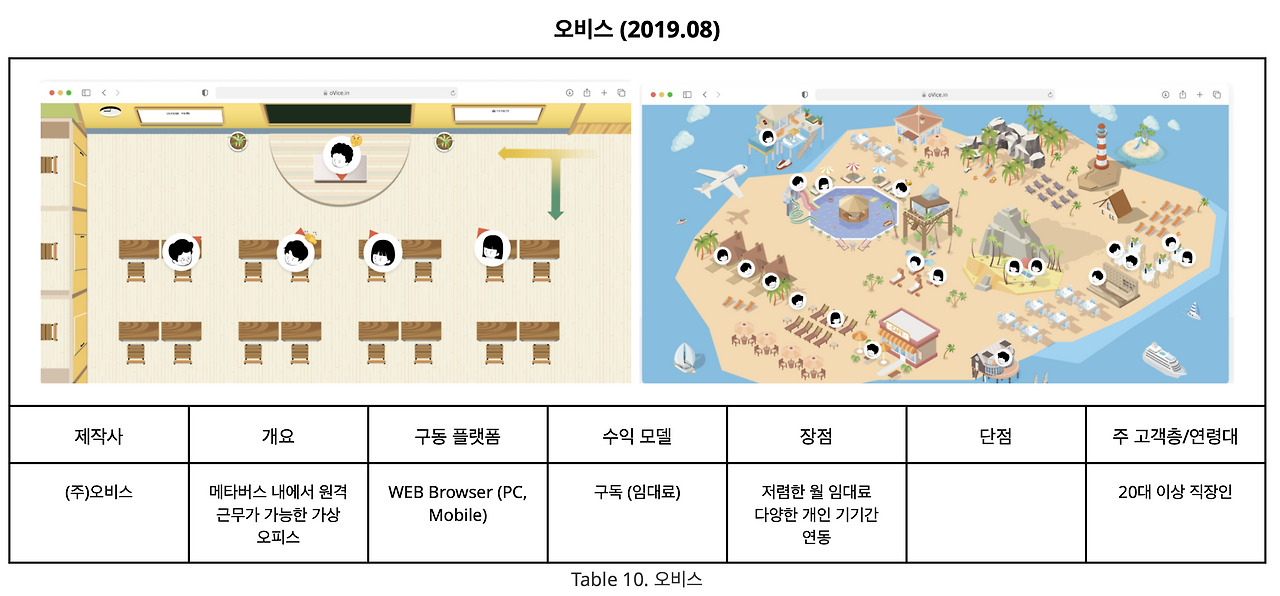 원격 근무를 도와주는 메타버스로 일상 대화부터 회의까지 다양한 커뮤니케이션을 단순 영상통화가 아닌 현실과 똑같은 방식으로 전개할 수 있다. 직접 아바타를 이동시켜 상대에게 접근해서 대화를 시작하고, 이동 중 들려오는 대화에도 참여할 수 있다. 특히 일정 구독하는 기업에 맞는 커스터마이징을 지원한다. 기업의 특성에 따라 공간의 구분, 층을 통한 구분, 업무 특성에 따른 구분 등을 통해 오프라인에서 근무하는 것과 동일한 경험을 제공하면서 업무적으로는 더 다양한 처리가 가능하다. 현실과 동일한 동선을 제공하는 것이다. 컨트롤이 쉬워 디지털 기기 사용에 어려워하는 연령층도 쉽게 사용이 가능하다.