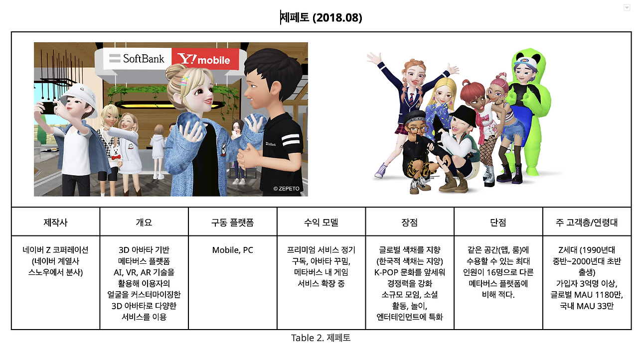 K-POP 콘텐츠를 주로 제공하고, COVID-19로 사라진 대학생활의 낭만을 되살릴 수 있는 이벤트를 제공한다. 개발사가 주도적으로 다양한 콘텐츠를 제공하고 있는데, 이는 기업이 메타버스를 테스트 용도로 제공하고 있음을 알 수 있다. 대학교, 공공기관, 지자체, 유통·제조업, 금융권, 엔터테인먼트, 전시·공연 등 다양한 업계와 제휴를 유치하고 있는데, 이는 기업이 마케팅 채널로 주로 사용하겠다는 것으로 볼 수 있다. 이런 행태는 메타버스를 제대로 활용하지 못하고, 소셜 네트워크의 확장판 정도로 전락할 수 있는 위험이 있다. 하지만 계속해서 개개인 간 수익구조를 만들 수 있는 콘텐츠 제작 서비스를 순차적으로 런칭하고 있어서 계속 성장할 수 있는 여지가 있다. 이는 기업이 시장에 빠른 출시와 더불어 시장 반응을 통해 계속해서 서비스를 수정하겠다는 의지로 보인다. lean production(린 생산방식)의 경영기법을 활용하는 것으로 보인다.