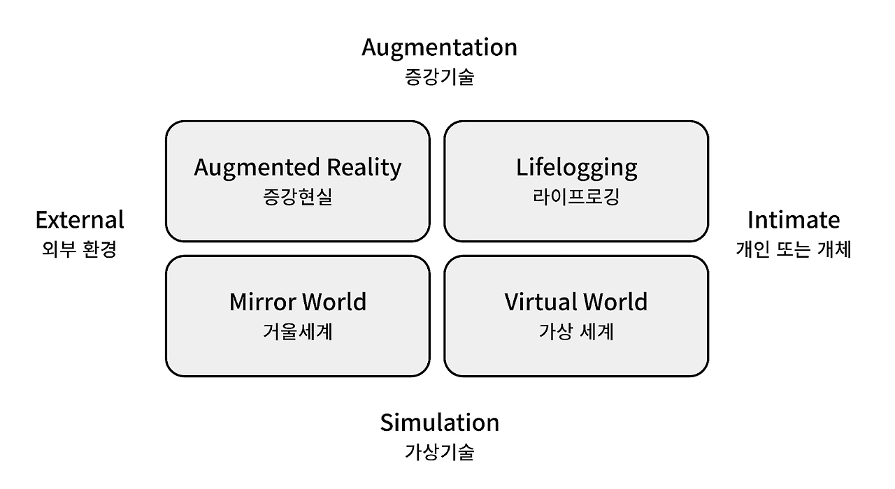 ASF(Acceleration Studies Foundation)는 2006년 메타버스의 유형에 대해서 구현되는 공간이 현실인지, 가상인지, 그리고 구현되는 정보가 외부 환경정보인지, 개인 또는 개체에 대한 정보인지에 따라 증강현실, 라이프로깅, 거울 세계, 가상세계 네 가지로 분류했다(Fig 1).
