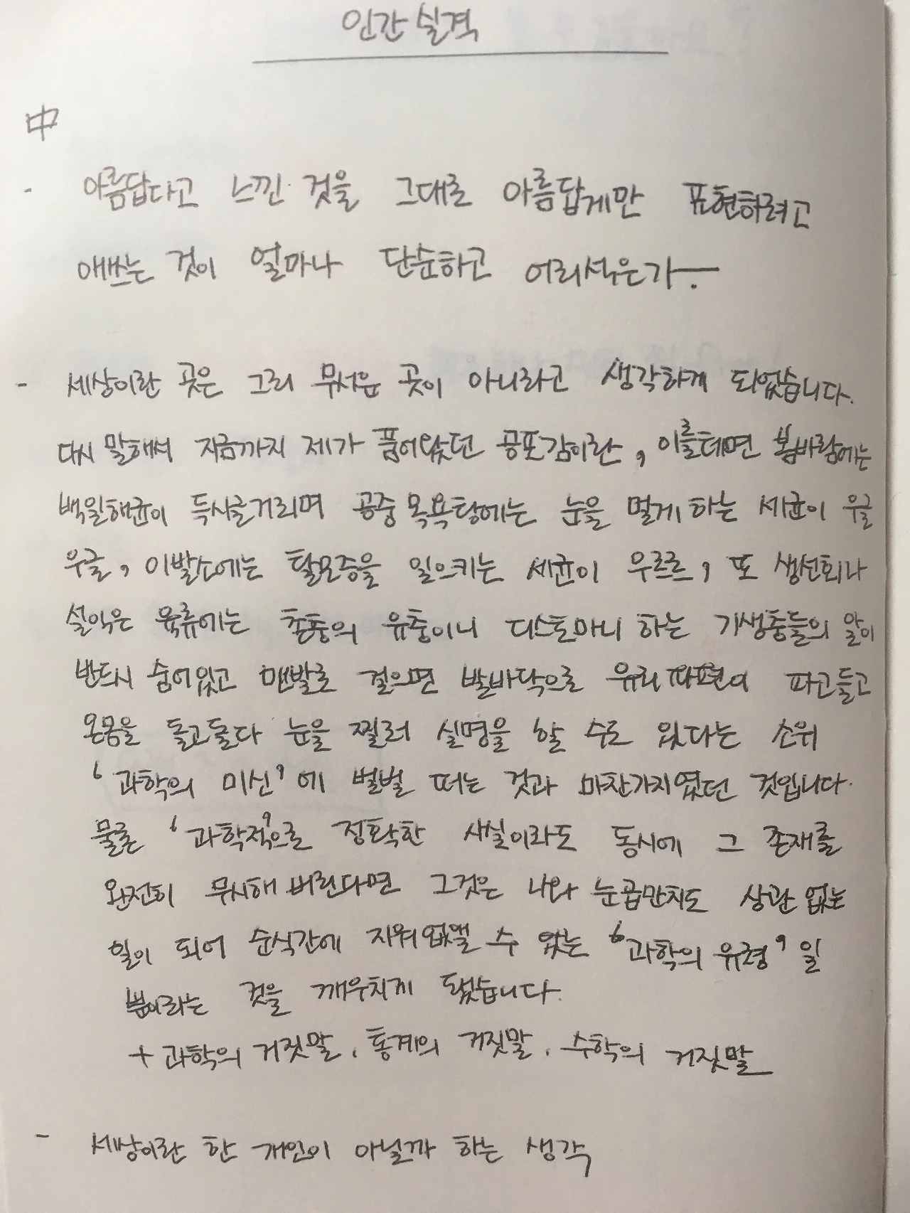 <인간실격>은 누구나 살아가면서 느끼는 회의적인 생각과 감정들을 문장으로 엮는 모음집이다. 요조는 다른 사람과 다른 내면을 가졌다고 주장하지만 사실 우리 모두는 한번쯤, 또는 자주 인생과 나 자신, 내 주변 사람글과 사회와 세상에 대해 회의적이다. 요조는 특별한 내면을 가진 사람이 아니라 그저 운이 좋지 않았던 평범한 사람이었다. 그의 수기가 끝났을 때, 그는 단지 27살이었다-.