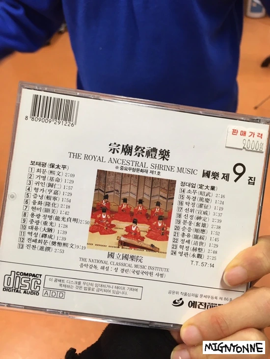 사실 노래만 들어서는 잘 몰랐지만 (;;) CD 케이스에는 커다란 한자로 <종묘제례악>이라 쓰여있었다. 아 읽으면 알죠ㅋ 뒷면에는 가격표가 아직도 붙어 있었는데, 한국 가격표였다. 와 이건 분명 한국에서 사 온 건데! 신기해서 어디에서 구한 것인지 물으니 선물로 받은 것이라 한다. 여러 나라의 전통 음악이나 민요를 좋아하는 선생님에게 어울린다. 내가 CD에 적힌 것을 보고 "오 이거요~!"라는 반응을 보이니 "너 이거 읽을 줄 아는 거야?!"라며 눈을 반짝이는 쌤. "아 넹 당연하죠!"라고 대답한 뒤 2초 있다가 "아, 근데 이게 한국어는 아니에요!"라고 덧붙였고, 1초 후에 "한국어는 아니지만 제가 그냥 읽을 수 있는 거예요!"라고 사족을 붙였다. 혹-시나 한자가 한국어라고 생각할까 봐.. ㅋㅋㅋㅋ 정확히 한글이 어떻게 생긴 것인지는 모르겠지만 나라마다 다 다른 쓰기 방식을 쓴다는 것을 알고 계신다고 했다.