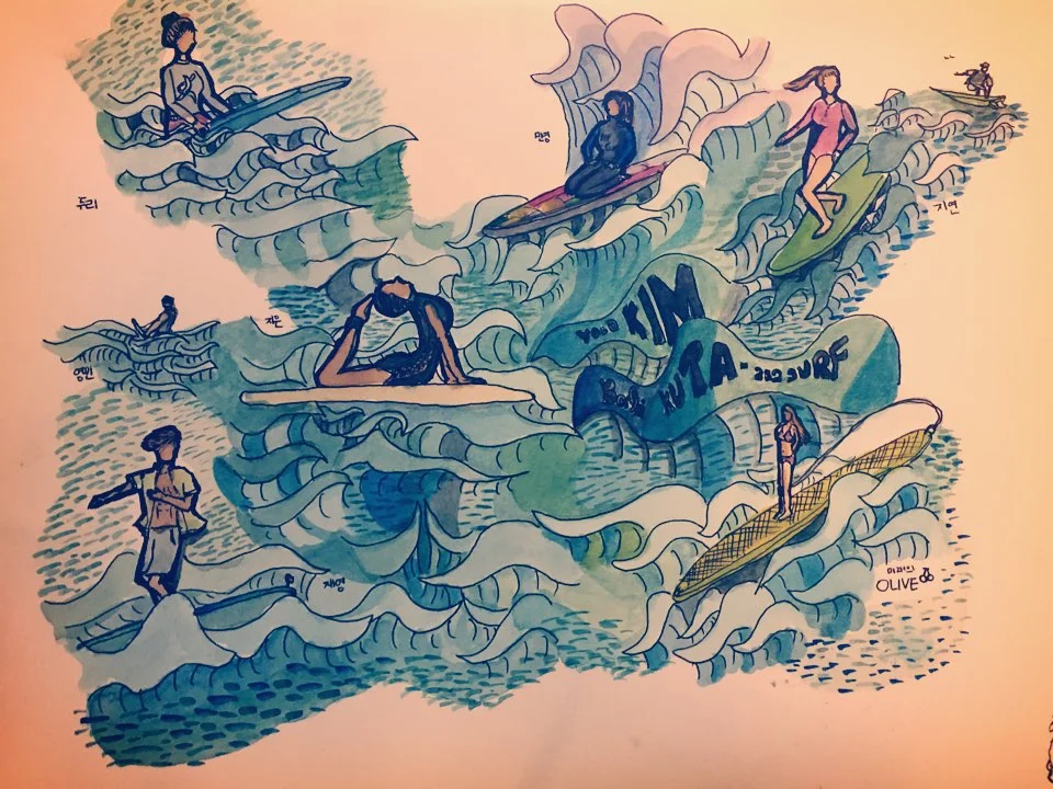 휴직 후 6개월간 발리에서 살기 시작한 올리브 언니. 회사에 휴가 내고 온 내 친구에게 언니는 퇴사 뽐뿌를 불러오는 원인이기도 했다. 그렇게 회사에서 나와 꽃길만 걸어야 하는 올리브 언니인데, 발리와선 지옥길만 걸어서 모두의 마음을 아프게 했었다. 어떤 이유에서인지 언니가 바다에 들어서면 잔잔한 바다에 큰 파도가 용솟음치곤 했었다. 그래서 우리 사이에서 올리브 언니는 파도의 전령이자, 파도 희생양으로 불리곤 했더랬다. 올리브 언니는 이미 나와 만나기 전, 보드 핀에 박혀 머리를 꿰맨다거나 자기 보드에 맞아눈탱이 밤탱이가 된다거나 하는, 보고도 믿을 수 없는 부상을 입었었다. 나와 함께 있을 때에도 오토바이 사고가 난다거나, 끈질긴 동남아 병으로 끙끙 앓았었는데, 내가 떠난 후엔 파도에 말려 고막이 터졌다고…
