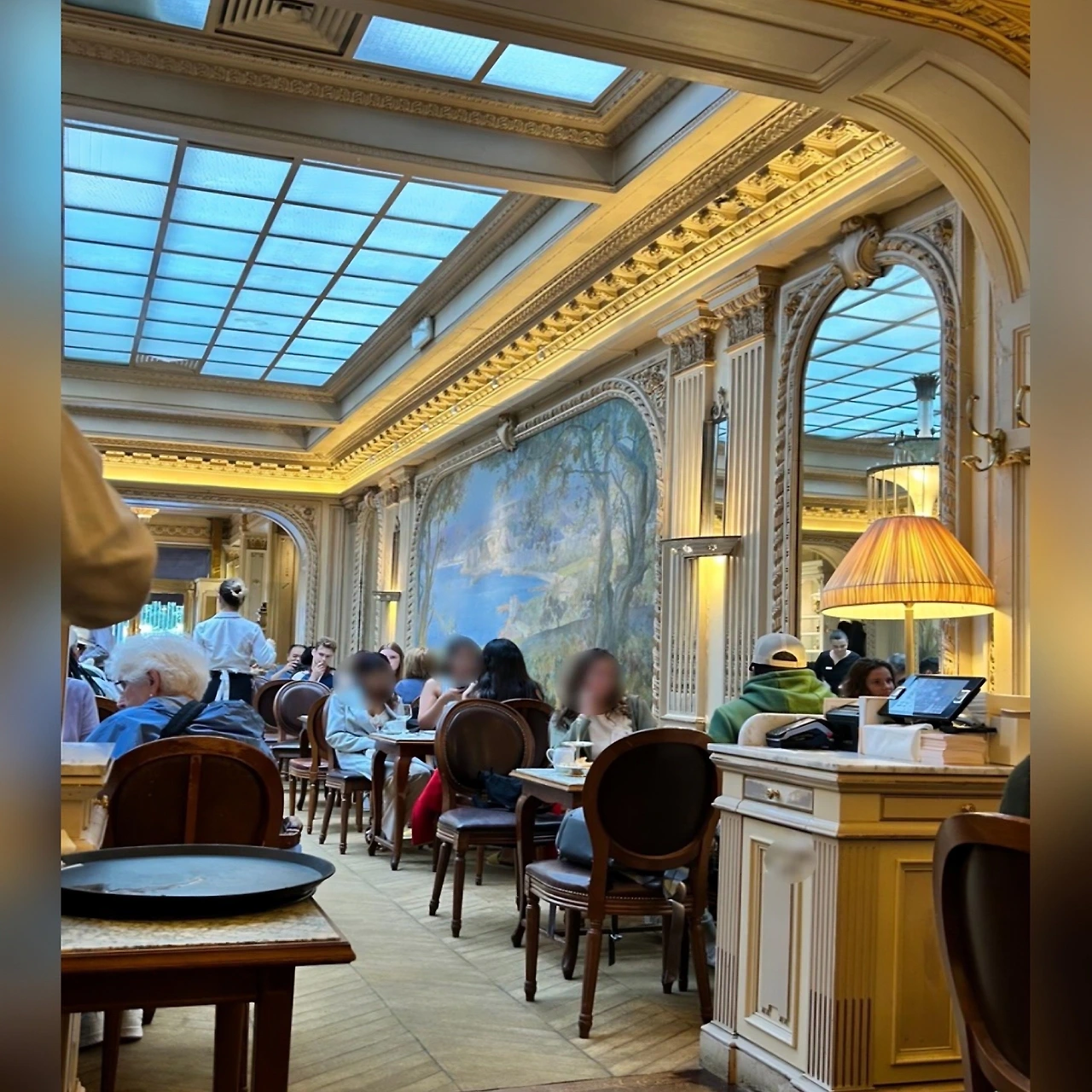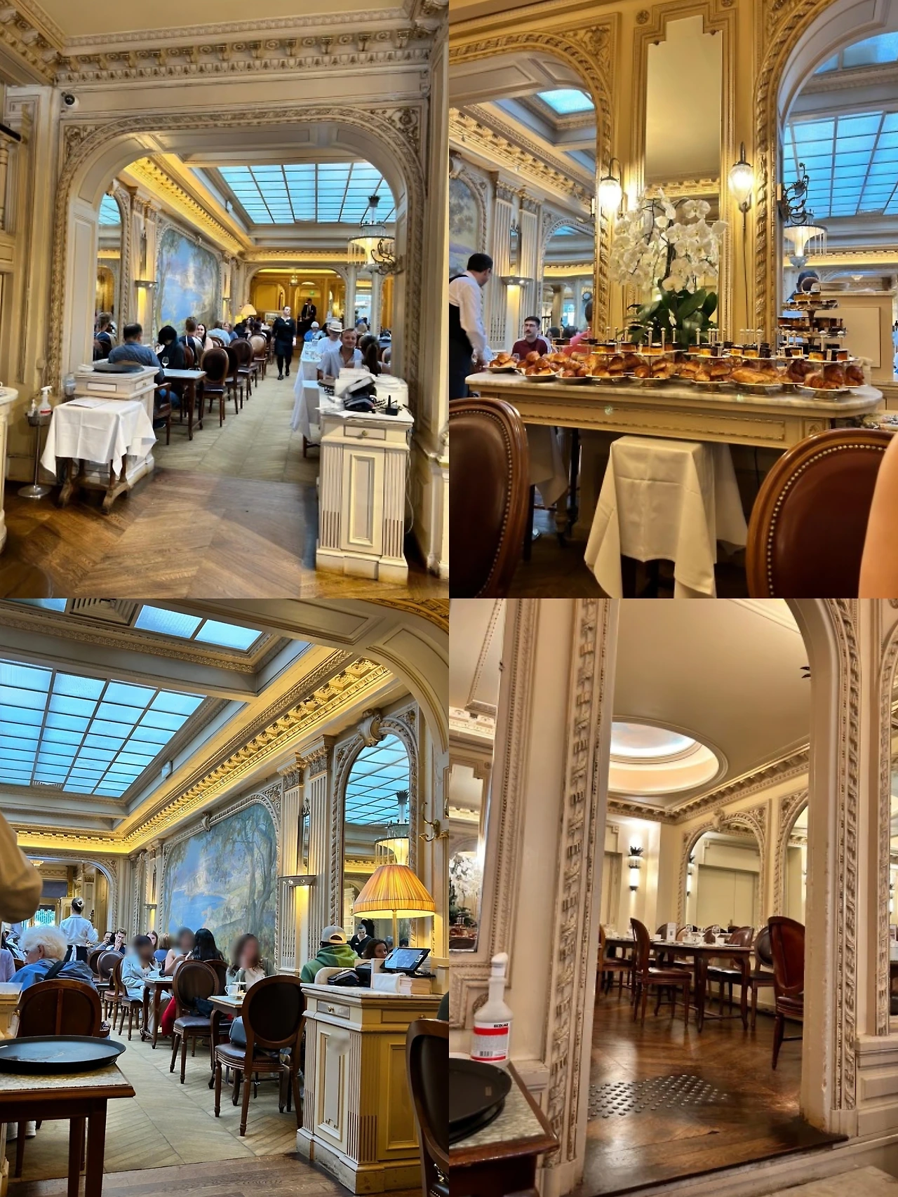 파리에서 처음 안젤리나 카페를 방문했을 때는 겨울이었다. 크리스마스 장식들로 더욱 화려했던 카페 안 분위기는 압도적이었다. 높고 아름다운 천장, 조각상, 벽면의 아름다운 무늬들, 벨 에포크 시대의 스타일이 그대로 반영된 듯한 고풍스럽고 우아한 매력에 나도 모르게 빠져들었다. 특히 크리스털 샹들리에와 부드럽고 로맨틱한 조명과 고풍스러운 가구들로 편안함을 느끼게 해 주었다.