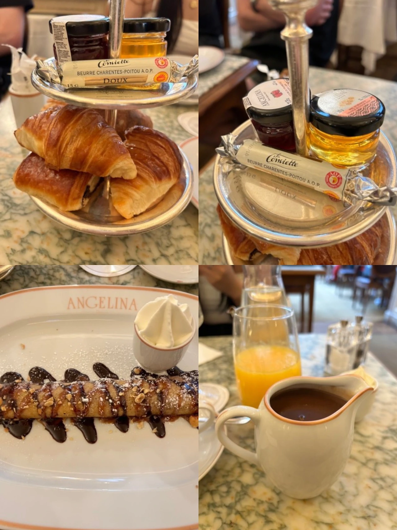 안젤리나 카페는 일찍 문을 열기 때문에 오전에 서두르면 웨이팅 없이 브런치를 맛볼 수도 있다. 오전 시간대에는 서비스가 빨리 이루어지는 편인 것 같아 나도 가끔 브런치 먹으러 들리기도 한다. 안젤리나 브런치를 시키면 미니 비에누아즈리(Viennoiserie)인 작은 모양의 크루아상과 빵 오 쇼콜라와 함께 발라 먹을 수 있는 버터와 잼들이 제공된다.