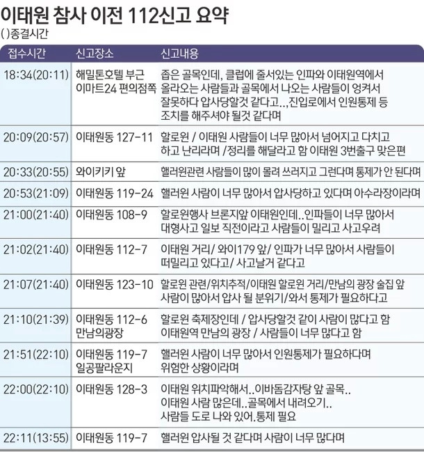‘압사 사고’ , ‘대형사고’ , ‘사람들 죽을 것 같다.’ 등의 112 신고가 11건이 접수되었음에도 아무런 조치도