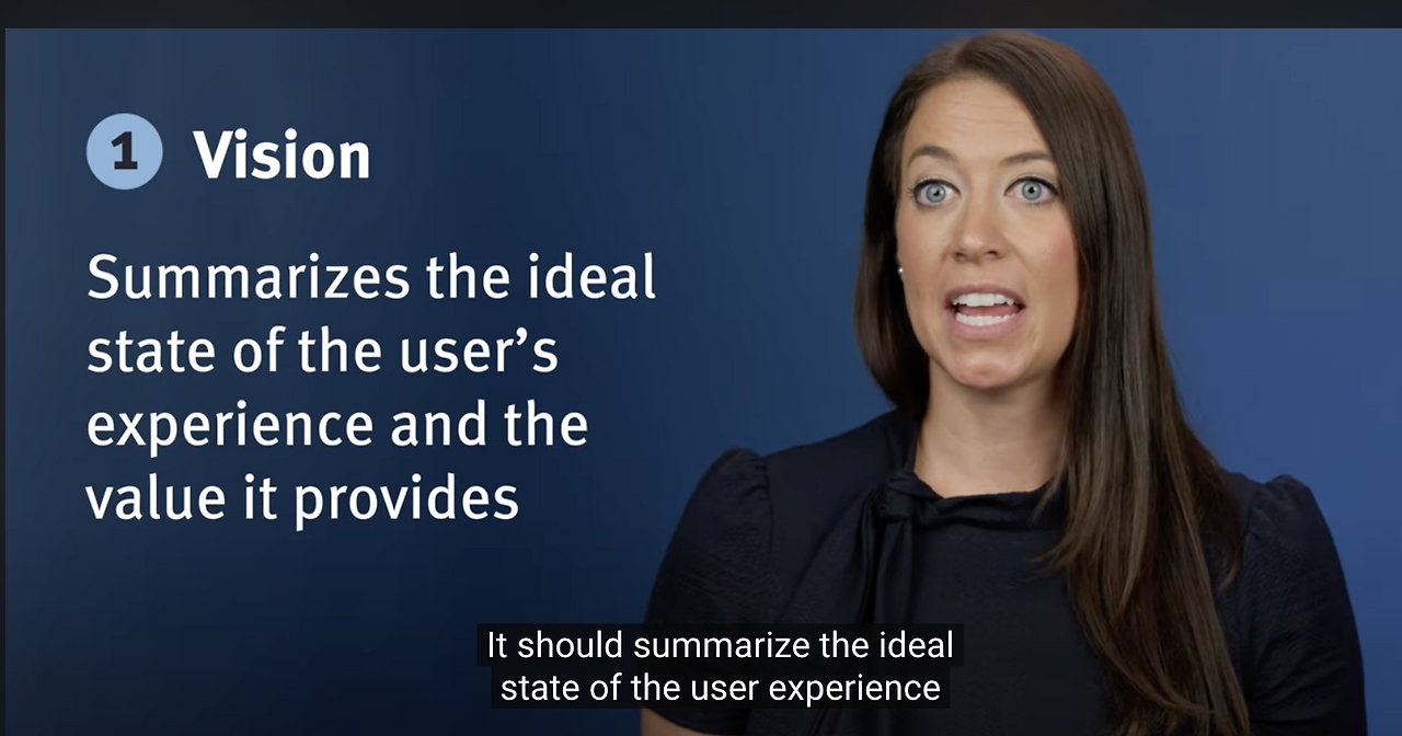 UX비전은 성공적인 미래의 모습을 의미한다. 팀은 어디로 가야 할지, 그리고 왜 그렇게 가야 하는지를 알아야 한다. UX 비전은 프로덕트 전략의 일부로서 사용자 중심의 비전이나 미션, 핵심 가치 제안, 차별화 또는 포지셔닝등과 함께 이러한 목표와 이상적인 결과를 전달한다. 비전은 상위 레벨이며, 사용자 중심으로 팀이 이루어야 할 성과를 상징하고 있다.
