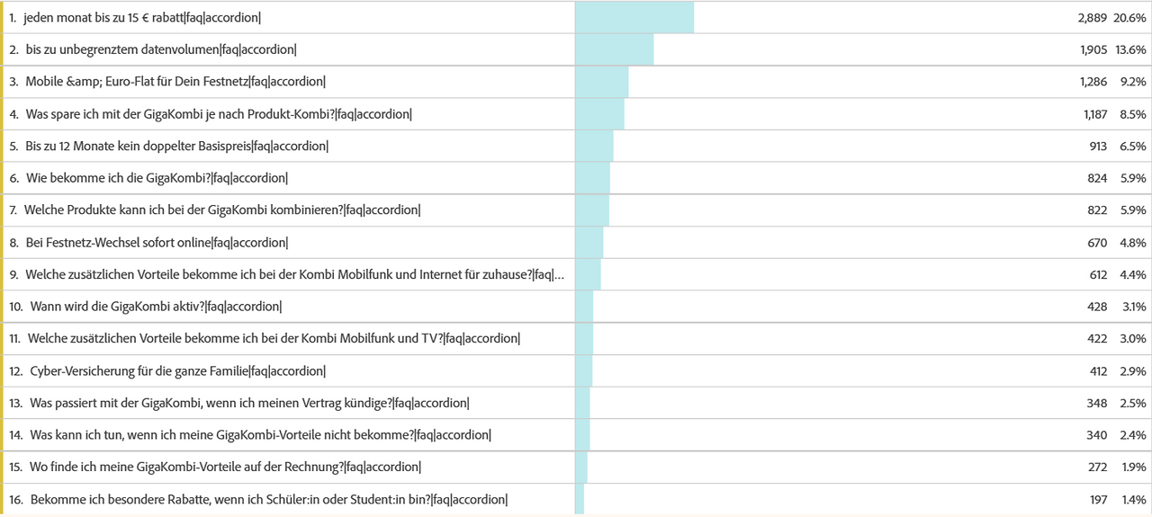 이를 통해 사용자들이 가장 많이 클릭한 FAQ가 매달 15프로 할인, 무제한 데이터 볼륨 등이라는 것을 알 수 있었다.