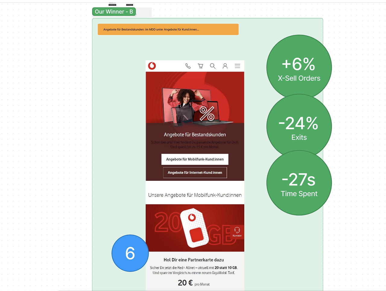 약 두 달간 진행되었던 AB 테스팅을 통해 리디자인한 랜딩페이지가 사용자와 비즈니스의 목표를 달성하는 데에 효과적인 것으로 나왔다. 리디자인한 렌딩페이지를 통해 모바일 제품을 구매한 사용자수가 6프로 이상 증가하였고, 24프로 이탈률 감소를 보여주었으며, 사용자들은 27초 적게 해당 랜딩페이지를 사용한 것으로 나왔다.