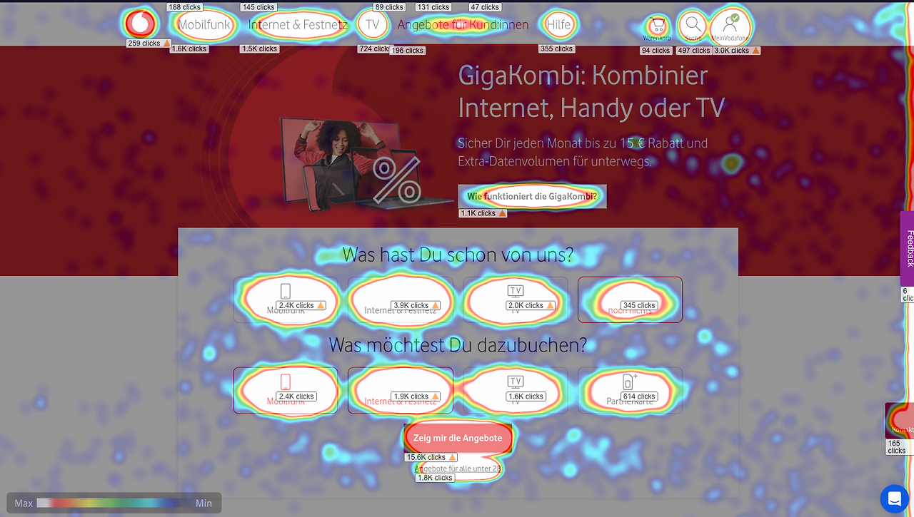 팀에서 렌딩페이지를 데이터 분석을 통해 리디자인 했던 예시를 소개해보고자 한다. 원래의 랜딩페이지는 페이지 헤더에 ****GigaKombi에 대한 간단한 프러덕트 소개를 하고 사용자에게 프로덕트, 다시말해 옵션을 선택하라고 제안한다. (참고로 아래 우측 그림에서 노란색으로 강조된 부분이 옵션 픽커, option picker이다.) 사용자들이 옵션픽커를 설정하면 그 아래 해당 옵션에 맞는 프러덕트(아래 우측, 핑크색으로 강조된 부분)를 추천해 주는 방식으로 랜딩페이지가 구성되어 있다. 그리고 그 아래 여러 가지의 광고와 프로모션, ***FAQ가 위치해 있다.