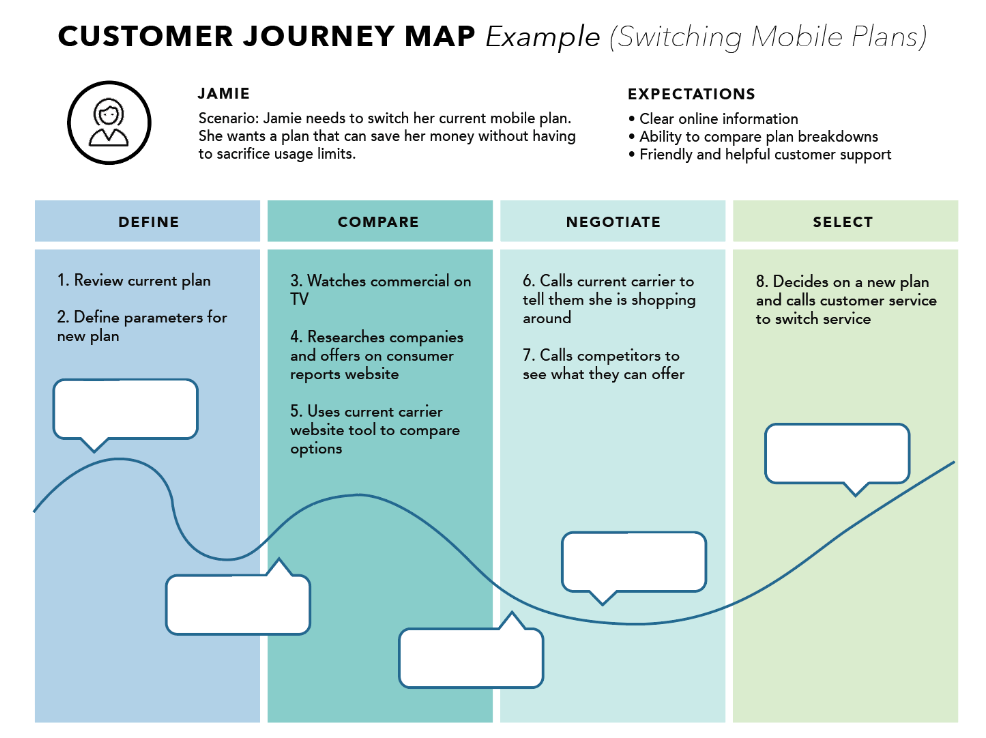 팀은 리서치 월에서 얻은 데이터를 바탕으로 여정 지도, Journey map을 워크숍에서 같이 만들 수 있다. 여정 지도는 전반적인 사용자 경험을 비주얼로 표현한다. 서비스와 관련된 사용자의 행위, 감정, 페인포인트, 바람 및 접촉 지점을 시각적으로 나타내어 팀원들의 공통된 이해를 도우며, 잠재적인 사용자 문제가 무엇인지 파악할 수 있다.