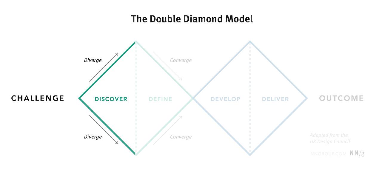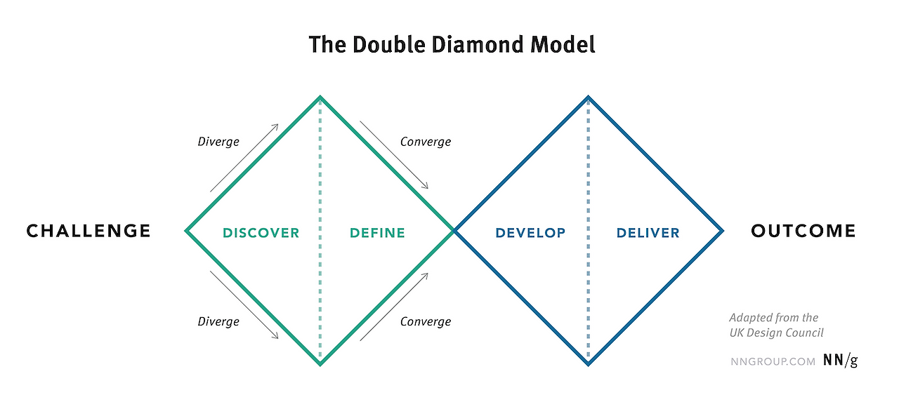 본론으로 들어와 디자인 싱킹과 함께 자주 언급되는 단어가 더블 다이아몬드(Doubel Dimond)이다. 더블 다이아몬드는, 문제 발견, 정의, 설루션 발전, 설루션 전달의 단계로 구성되어 있다. 다음 단계로 넘어가기 위해서 반복되는 활동이 Diverge and Converge이다. 의역하면 아이디에이션 그리고 아이디어의 선택이다. 아이디에이션 단계에서는 사용자의 문제 그리고 설루션에 대해 가능한 한 많은 아이디어를 내는 것에 초점을 둔다면, 아이디어의 선택 단계에서는 말 그대로 사용자의 가장 중요한 문제가 무엇인지 아니면 해당 문제를 효과적으로 해결할 수 있는 아이디어를 선택하는 것에 목표를 둔다. 그러면 프로토타이핑을 하는 설루션 전달을 제외한 각 단계에서 사용할 수 있는 도구에 대해 알아보자.
