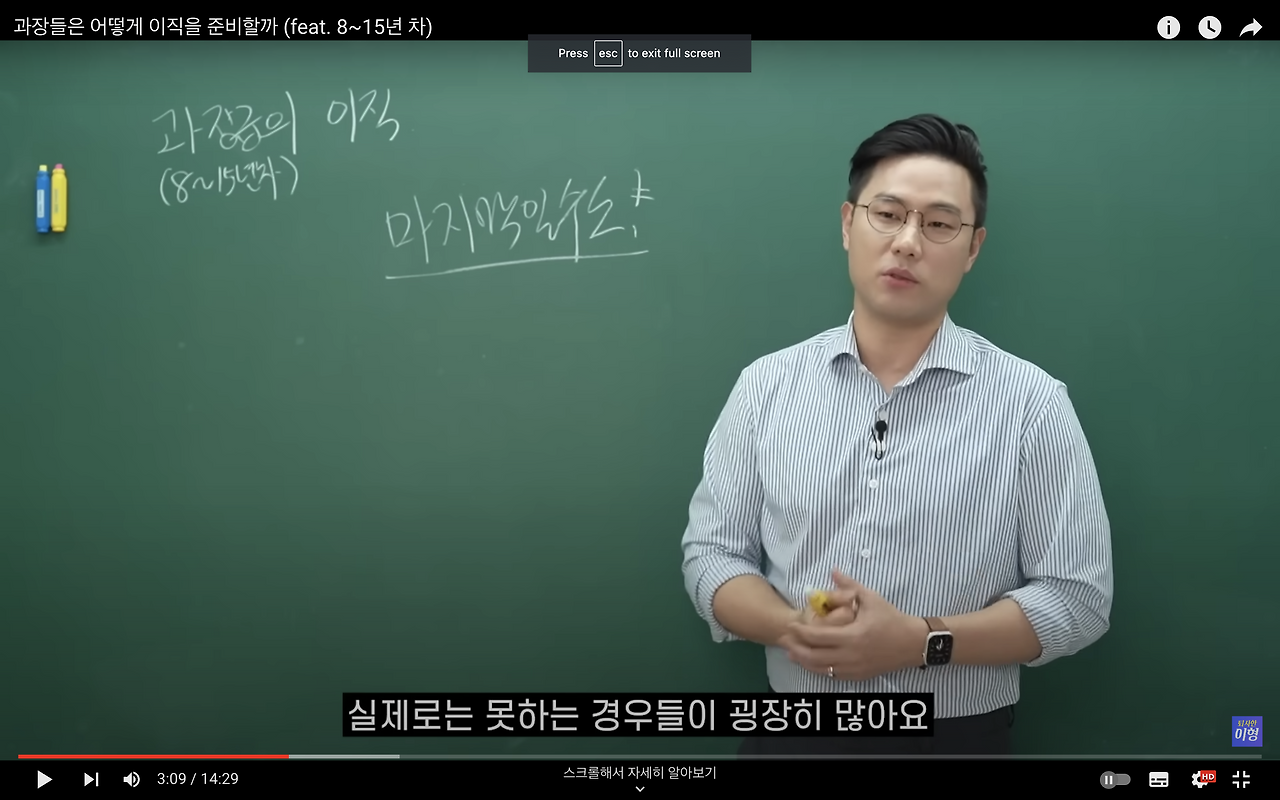 고용시장을 보면 매니저 포지션 직전인 시니어, 중간 레벨(intermediate)의 팀원을 가장 많이 뽑는다. 개인적으로 느끼기에 중간레벨이 전체 고용시장에 60%, 시니어 레벨 35% 그리고 나머지 5%는 디렉터나 주니어 급을 채용하는 것 같다. 그렇기에 시니어 레벨이상의 포지션(과장이상)을 원한다면 사실 이직이 쉽지 않다. 회사 안에 사원, 주임, 대리는 많아도 상대적으로 과장, 차장은 수가 적기 때문이다. 그렇기에 이직을 준비한다면 가급적 과장 이전에 이직을 하는 것이 원하는 포지션으로 가게 될 확률이 높다.