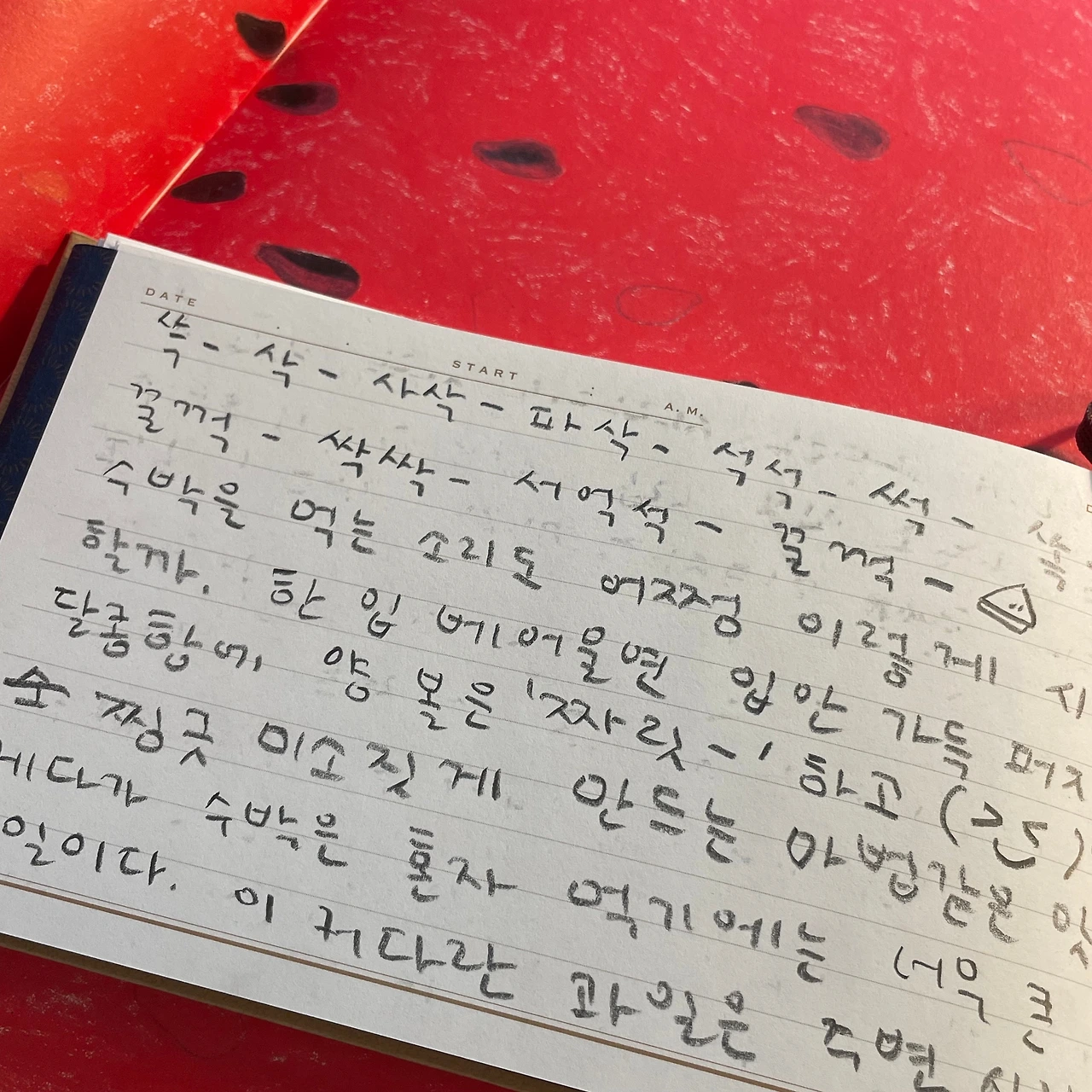 슥 - 삭 - 사삭 - 파삭 - 썩 - 석석 - 쏙 - 꿀꺽 - 싹싹 - 서억- 꿀꺽 수박 먹는 소리는 늘 시원하고 기분 좋다. 한 입 베어 물면 입안 가득 퍼지는 달콤함에 양 볼은 찌르르하고, 나도 모르게 미소 짓게 만드는 달콤함이란! 마법 같다.