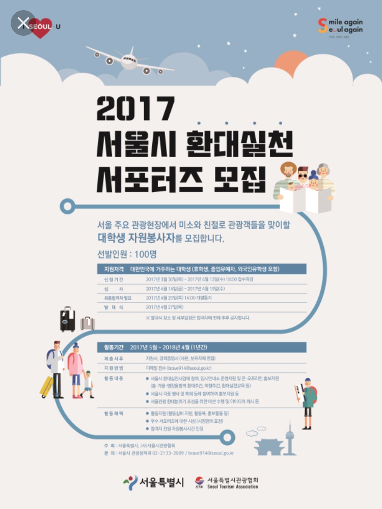 생각만 하고 있던 차에, 스펙업 카페에서 '서울시 환대실천 서포터즈 모집' 글을 보게 됐다. 서울시 관광협회와 서울시청이 함께 주관하는 이 서포터즈는, 현재 관광마케팅을 배우고 있고 관광여행관련 대외활동을 해 보고 싶었던 나에게는 구미가 당기는 활동이 아닐 수가 없었다.
