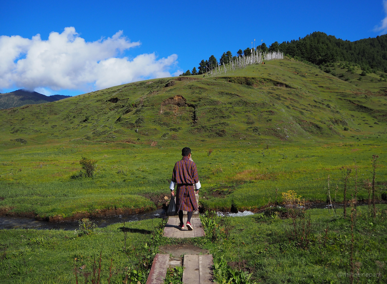 오늘은 포브지카 계곡(Phobjika Valley)을 하이킹(Hiking)하는 것으로 시작한다. 초원 지대에서 강테 사원(Gangtey Gompa)까지 걸어가는 코스다. 도마는 더울 텐데 괜찮겠냐고 다시 한번 물었다. 도마가 가고 싶지 않은 건 아닐까? 도마는 말할 때 억양의 변화가 거의 없어서 말속의 생각을 알아채기가 어렵다. 딱 한번, 놀랐을 때 어머머머머!라고 말했지만 그것조차 높은음을 내지 않았다. 물론 마음이 어떻든 간에 그는 가야 했다. 우리는 이미 신이 나 있었으니까. 이렇게 좋은 날 걷지 않을 수는 없다.