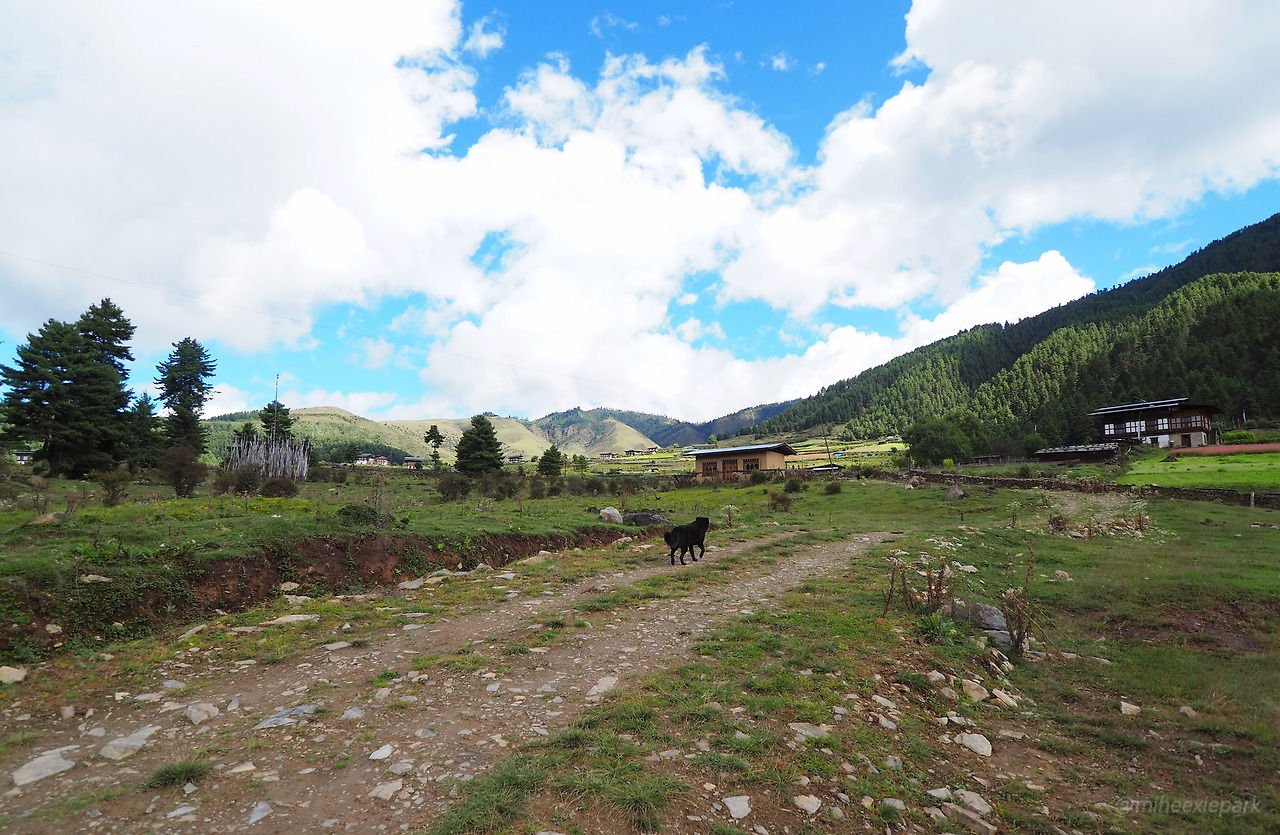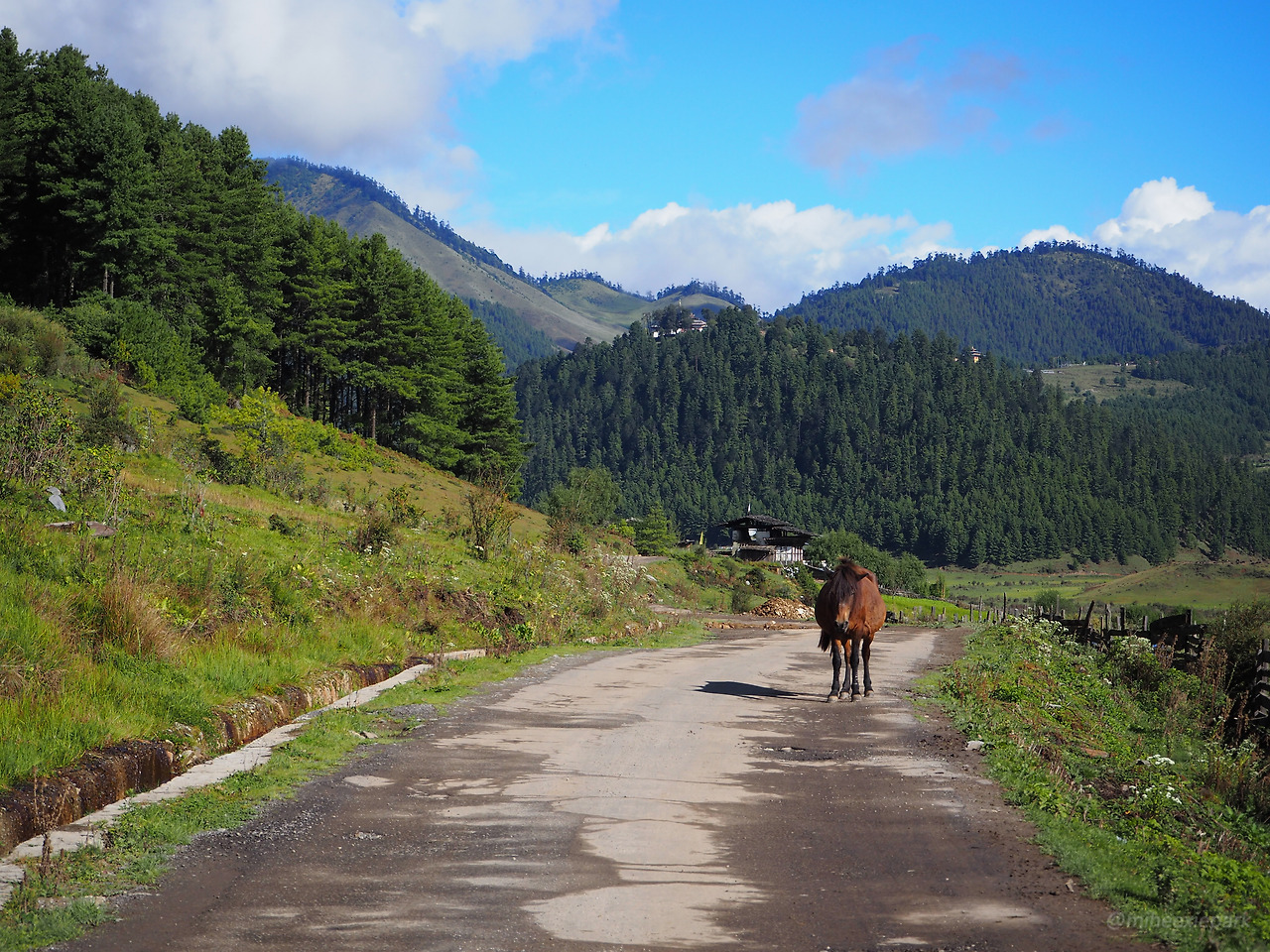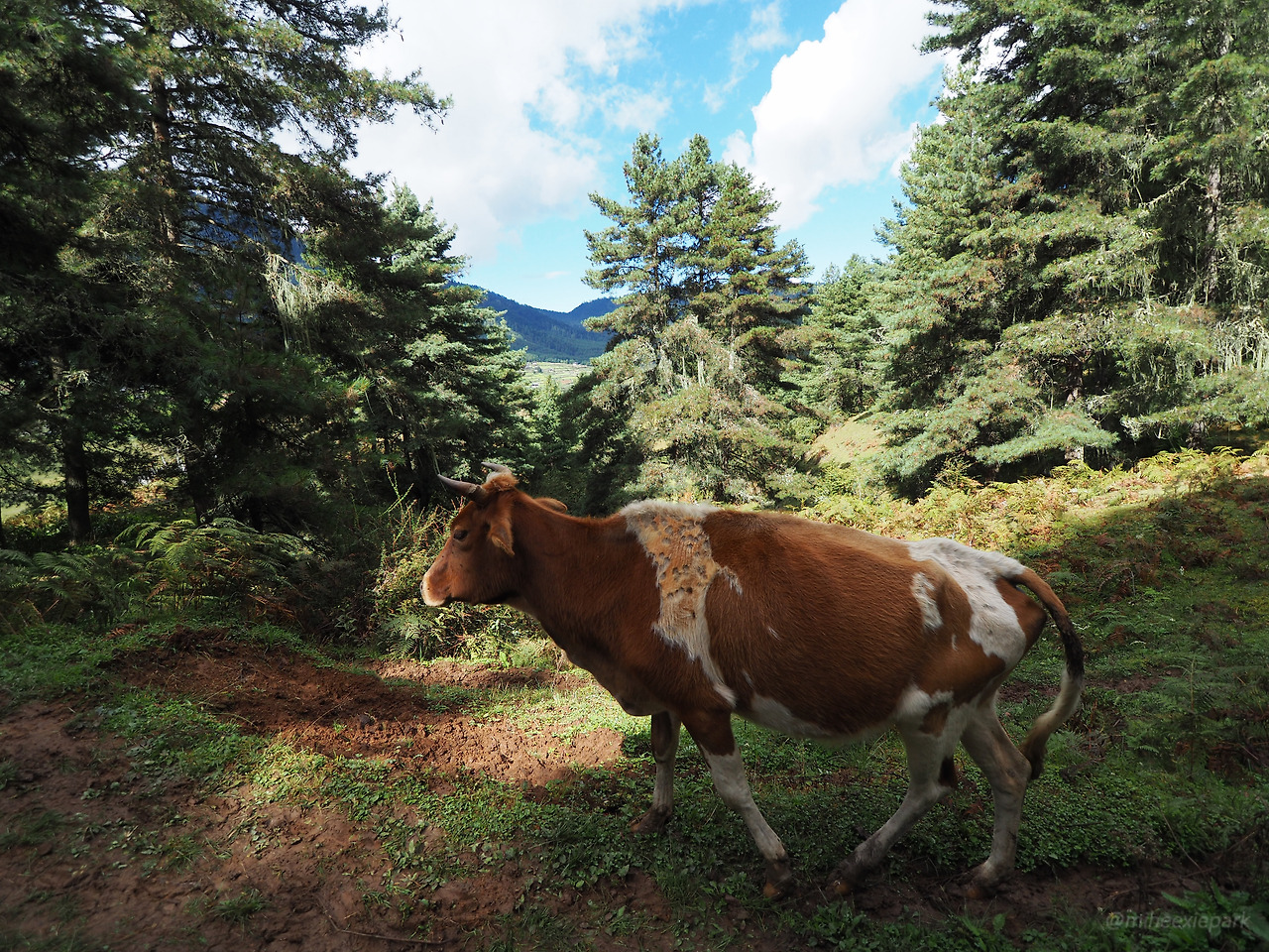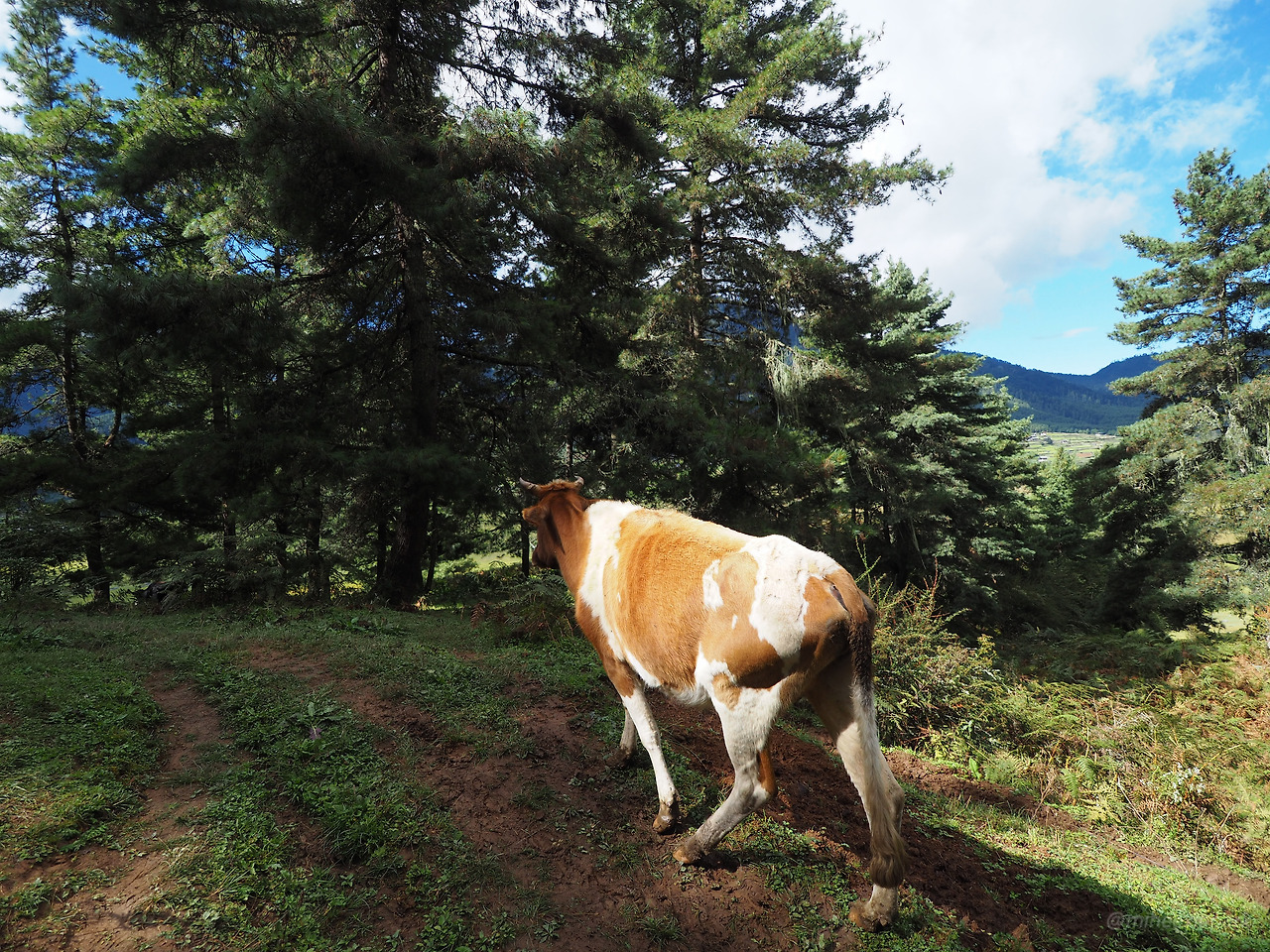 보통 부탄에서는 소, 말, 개가 차량의 진로를 방해할 정도로 많이 돌아다닌다. 주인이 있긴 하지만 울타리 친 축사에 갇혀 있는 게 아니라, 풀밭으로 몰고 가서 풀어놓기 때문에 쉽게 눈에 띈다. 그들은 자신의 삶, 즉 먹고 쉬고 걷는 것 말고는 관심이 없었다. 차를 타고 다니면 진로를 방해받는 경우가 왕왕 있다. 물론 아무도 화를 내지 않는다. 일단 우리를 인지하고 비켜주길 기다려본다. 안 되겠다 싶을 때는 남걀이나 도마가 취취-와 비슷한 소리를 냈다. 그 소리를 알아듣는지 힐끔 쳐다보고는 옆으로 비켜갔다.